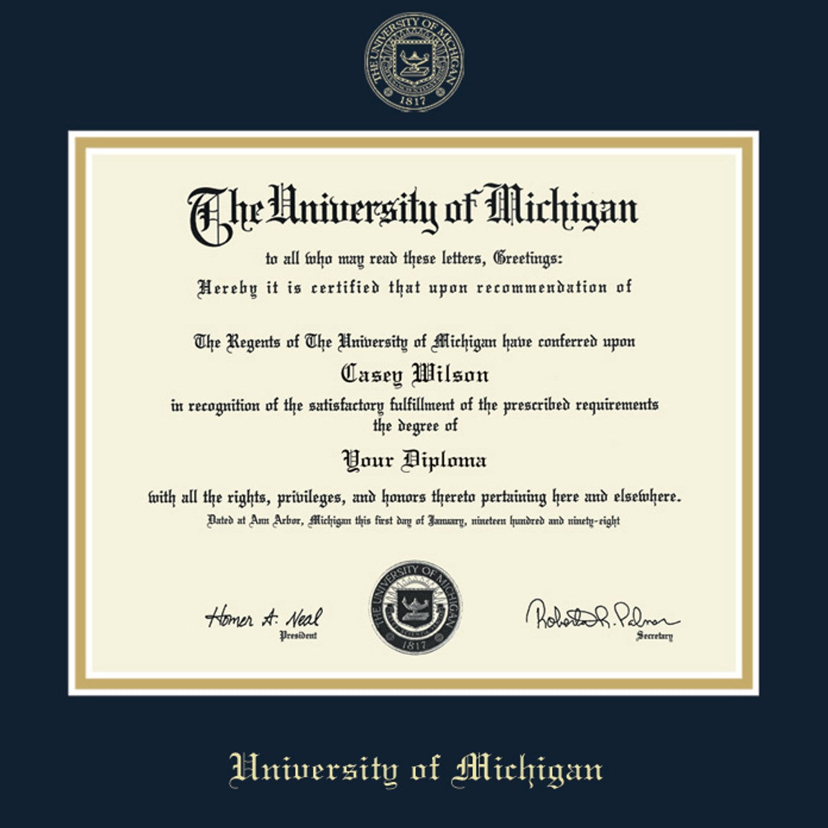 This University of Michigan diploma frame is crafted from solid wood in the USA. Proudly display your Michigan Diploma with museum quality conservation mounting materials to showcase and protect your University of Michigan diploma.