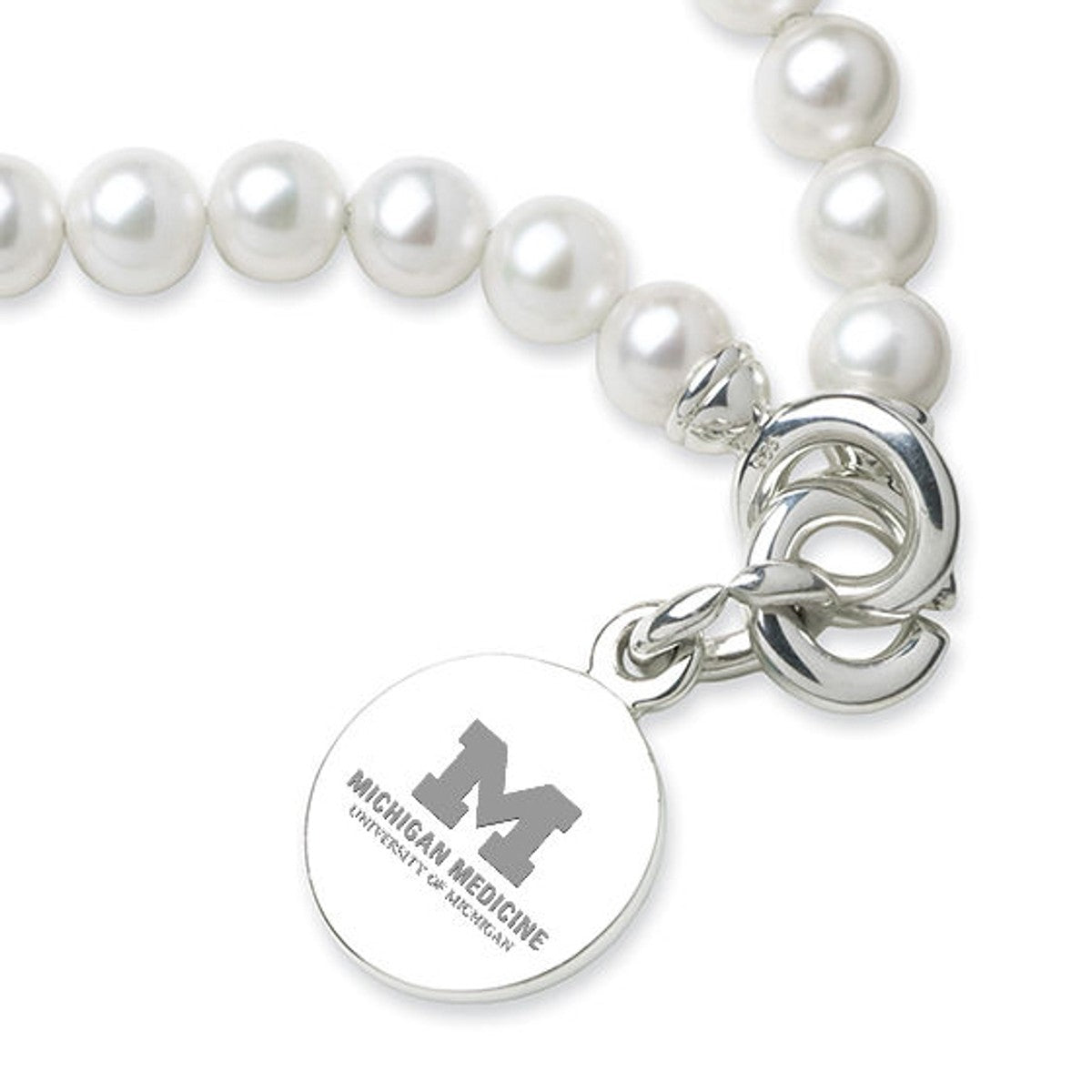 University of Michigan Medical School pearl bracelet and sterling silver U-M Medical School charm features the University of Michigan Medical School logo delicately engraved on front and interlocking "C" clasp.