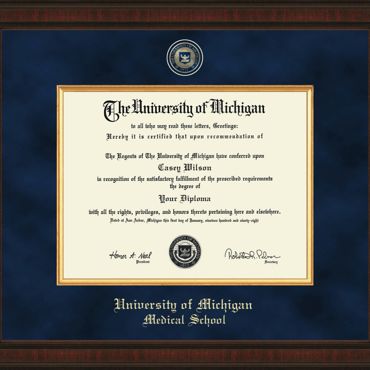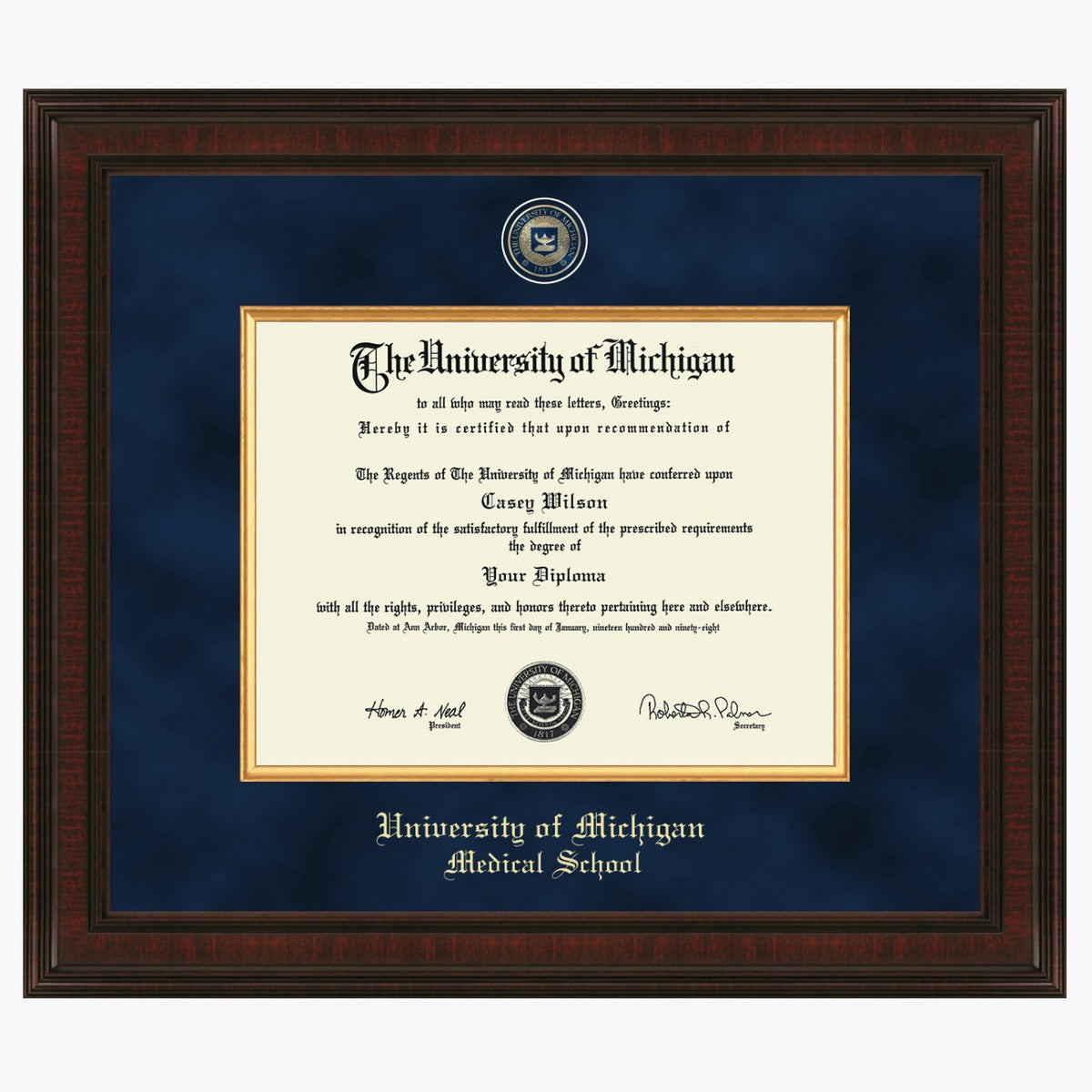 This University of Michigan Medical School diploma frame is specifically made to showcase and preserve your University of Michigan Medical School Diploma. Made from solid wood in the USA to meet stringent Library of Congress standards for archival document preservation.