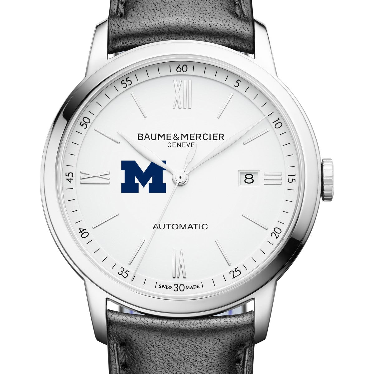 Experience the perfect fusion of school traditions and modern innovation with the Michigan Men's Baume et Mercier 42mm Classima Automatic Watch. Its crisp white matte dial with the Michigan logo, polished steel hands, and black leather strap embody effortless elegance and superior Swiss craftsmanship. Complimentary personal engraving.