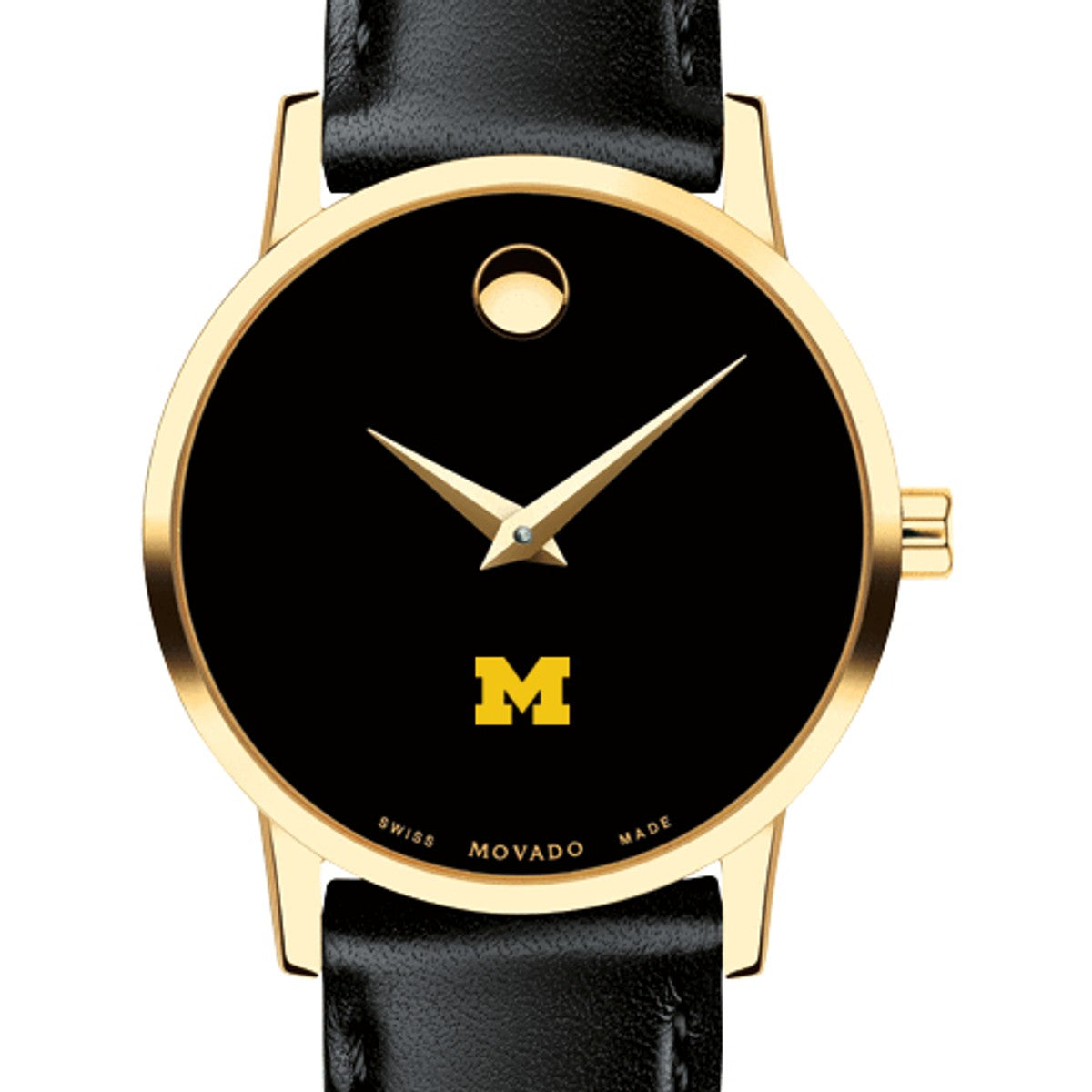 University of Michigan Women's Movado Museum watch features the Michigan Logo in full color at 6 o'clock on black dial. Created in 1947, the iconic concave dot symbolizes the sun at high-noon. Complimentary personal engraving.
