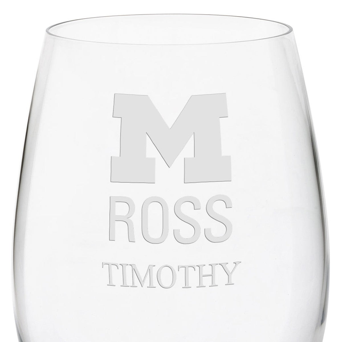Fine Ross School of Business wine glasses are an elegant touch for your table or bar. The Michigan Ross logo is deep-etched on each glass.