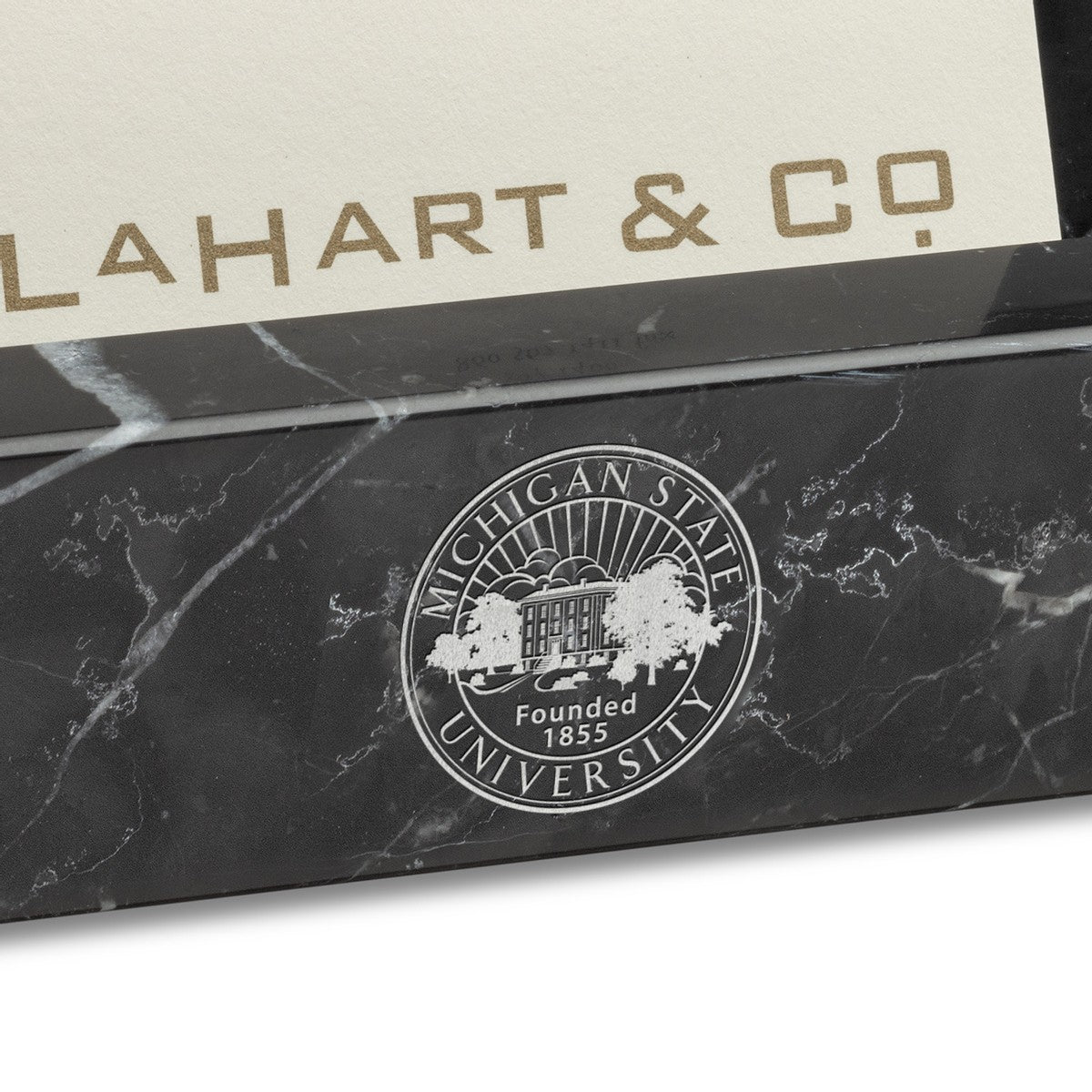 Perfect for new grads and seasoned professionals, the officially licensed Michigan State University marble cardholder is an essential for the desk of Michigan State fans. The Michigan State Logo is elegantly featured on the front of this substantial, solid marble card holder and accommodates all standard size business cards.