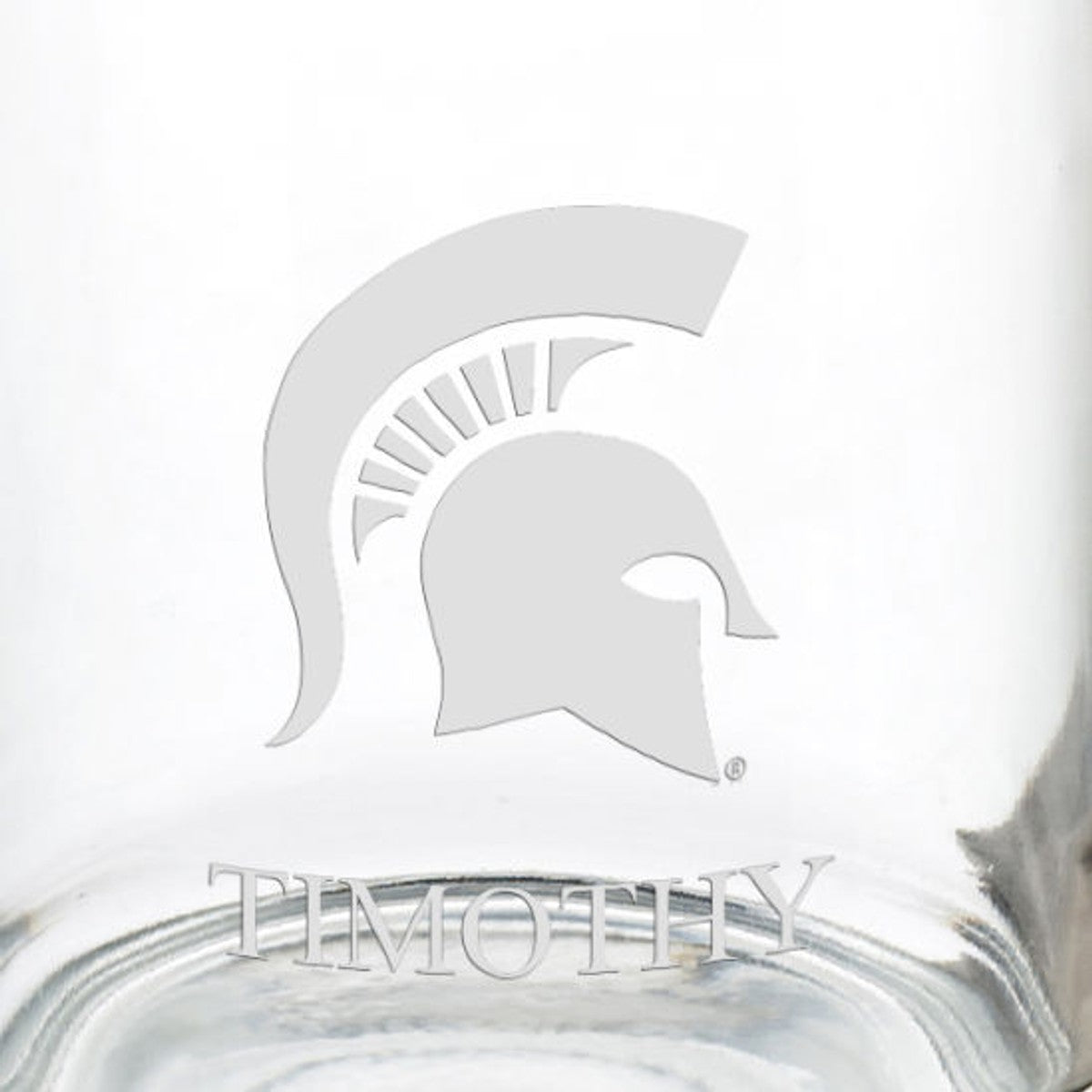 The Michigan State glass coffee mug is deep-etched with the Michigan State University logo. Generously proportioned 13 oz glasses are a pleasure to hold. Your name can be added under the logo for free.