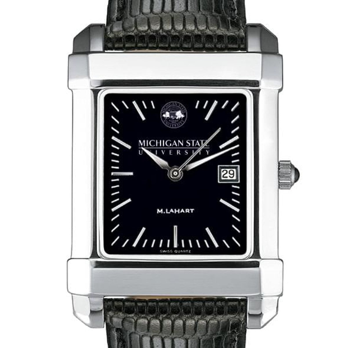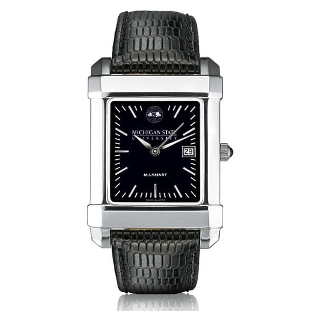 Michigan State University men's steel watch featuring MSU seal at 12 o'clock and "Michigan State University" inscribed below on the black dial.