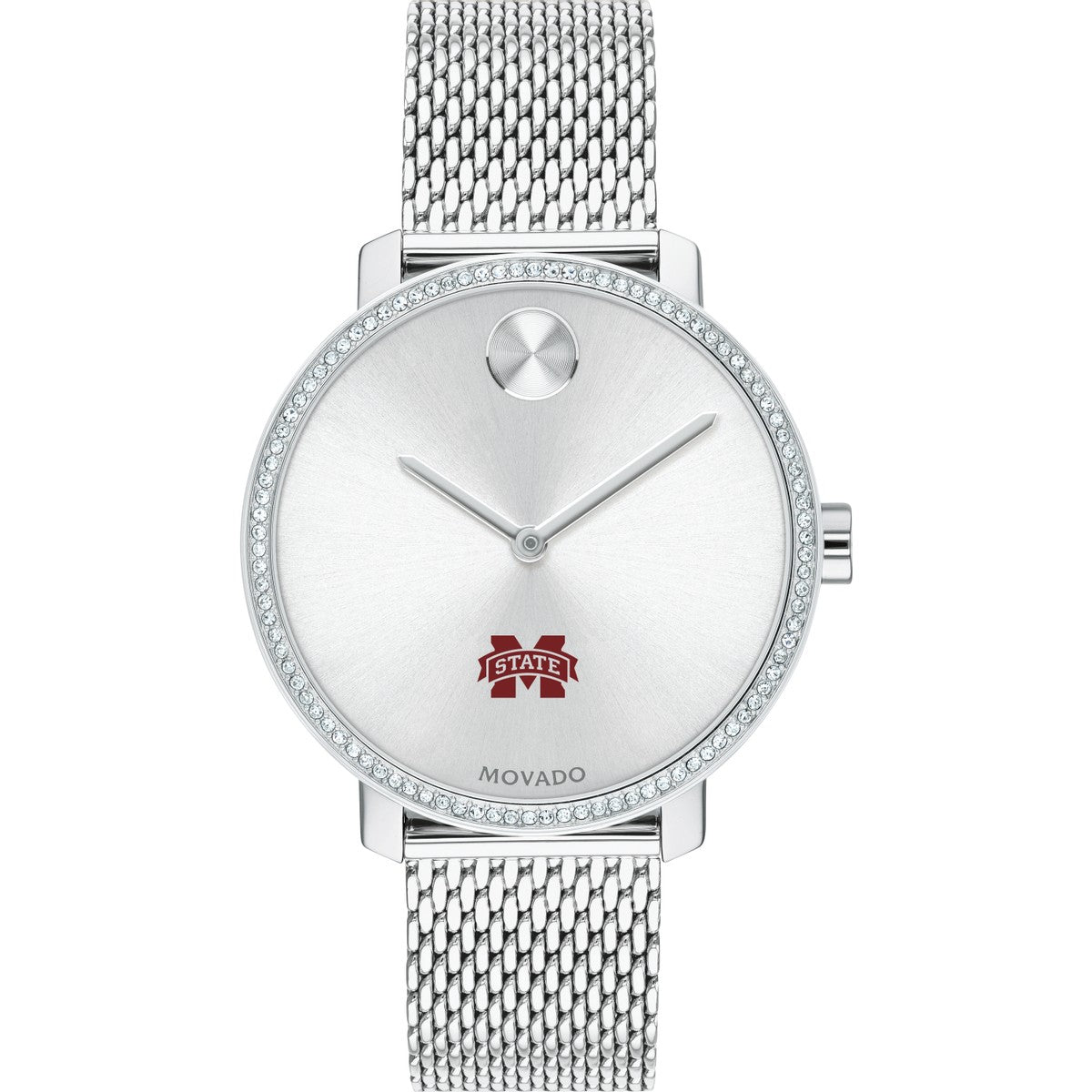 Mississippi State Women's Movado BOLD watch features the MS State Logo in full color at 6 o'clock on silver sunray dial.