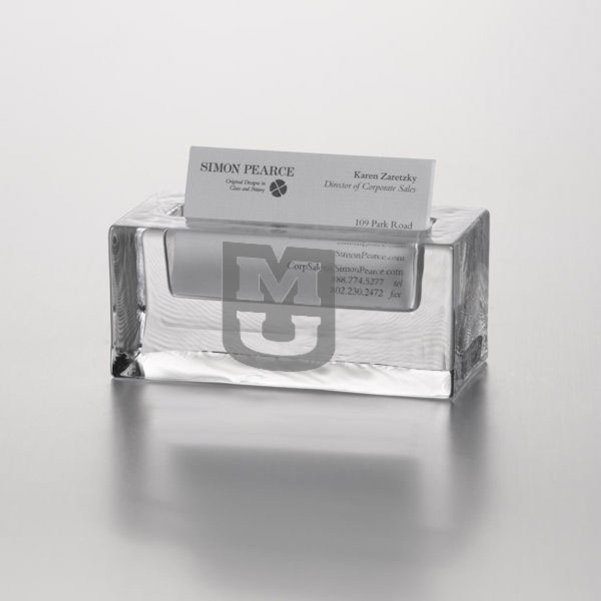 The University of Missouri Glass Business Cardholder is a functional adornment to any working environment. Formed from only the finest clear glass, the Missouri logo is distinctly etched on the front.