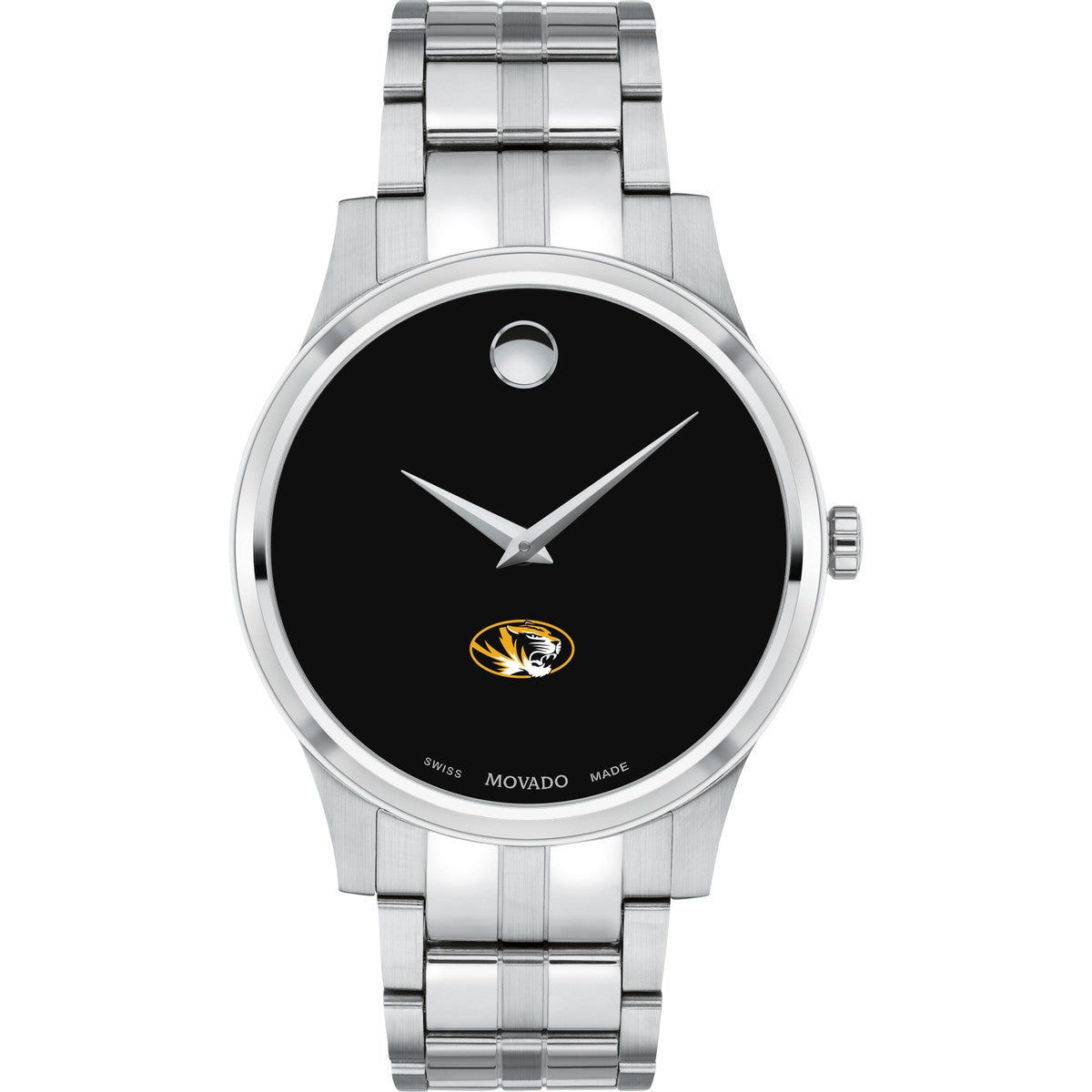 The University of Missouri Men's Movado Collection watch showcases the iconic Missouri logo in full color on a sophisticated black dial. This classic timepiece, featuring the renowned concave dot symbolizing the sun at high noon, has been a design masterpiece since its creation in 1947. Personalize your watch with free engraving without any delay to your order.