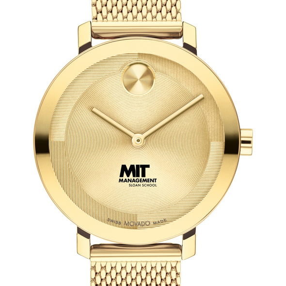 The MIT Sloan School of Management Women's BOLD Movado features the prestigious MIT Sloan logo. Its pale gold Ionic-plated stainless steel mesh bracelet exudes contemporary elegance, making it a timeless accessory for the modern woman.