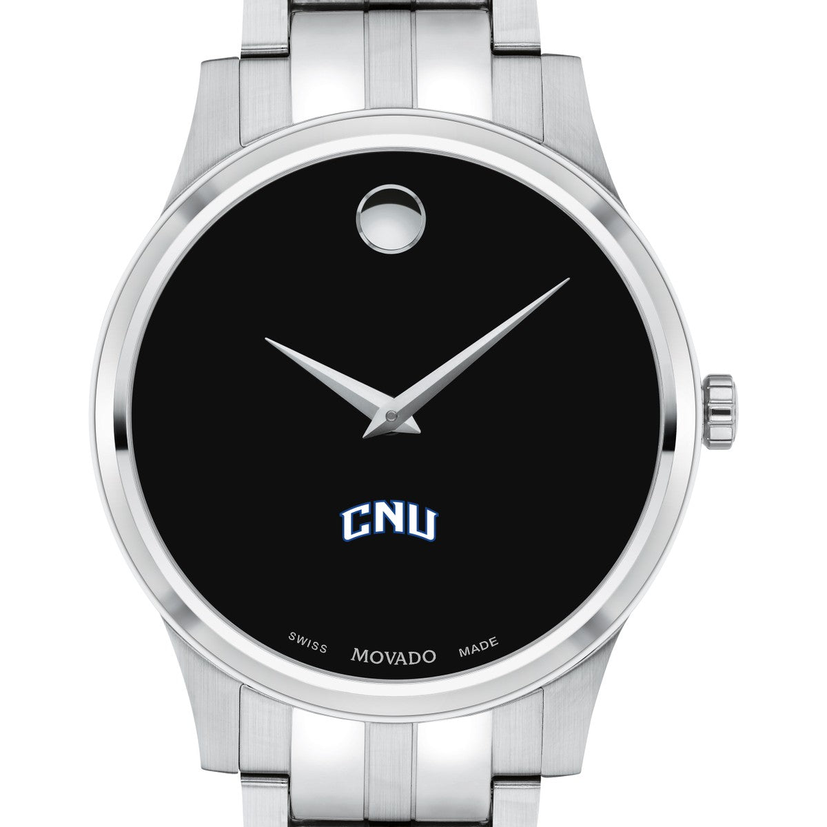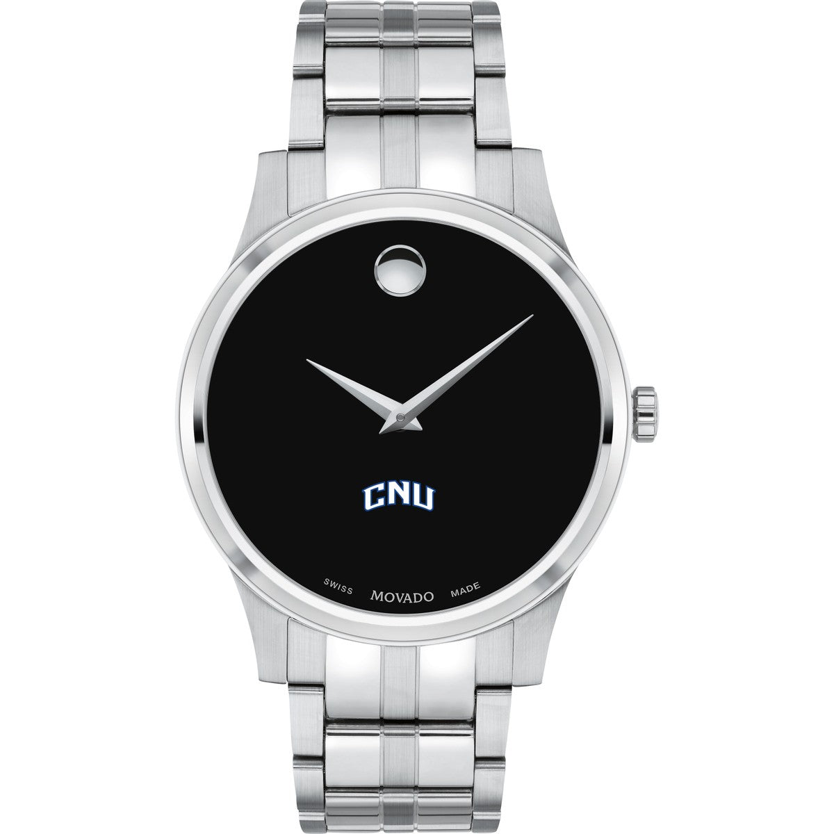 The Christopher Newport University Men's Movado Collection watch showcases the iconic CNU Logo in full color on a sophisticated black dial. This classic timepiece, featuring the renowned concave dot symbolizing the sun at high noon, has been a design masterpiece since its creation in 1947. Personalize your watch with free engraving without any delay to your order.
