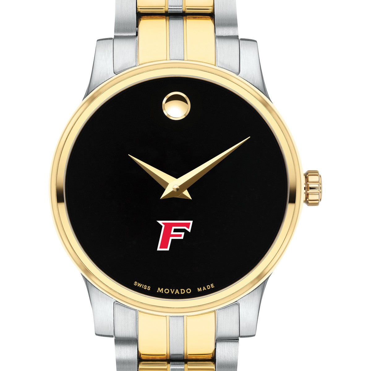 The Fairfield University Women's Movado Collection watch showcases the iconic Fairfield Logo in full color against a sophisticated black dial. This elegant timepiece, featuring the renowned concave dot symbolizing the sun at high noon, embodies timeless style. Personalize your watch with free engraving without any delay to your order.