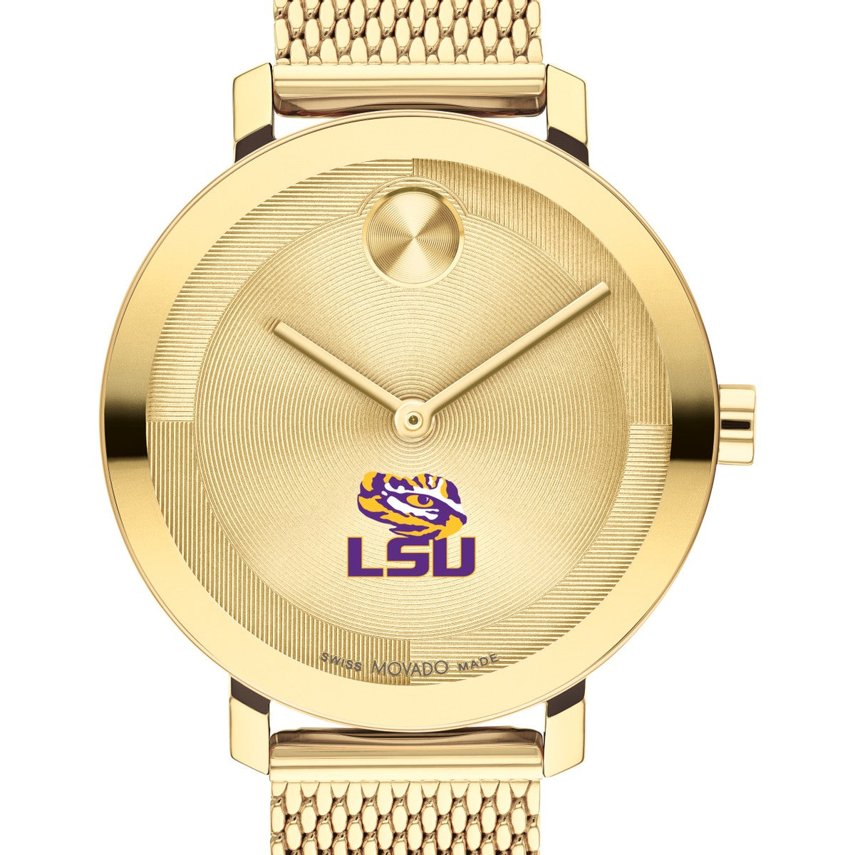 The Louisiana State University Women's BOLD Movado features the prestigious LSU Logo. Its pale gold Ionic-plated stainless steel mesh bracelet exudes contemporary elegance, making it a timeless accessory for the modern woman.