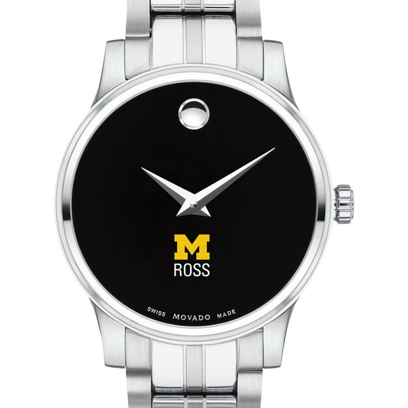 The Ross School of Business Women's Movado Collection watch showcases the iconic Michigan Ross logo in full color against a sophisticated black dial. This elegant timepiece, featuring the renowned concave dot symbolizing the sun at high noon, embodies timeless style. Personalize your watch with free engraving without any delay to your order.