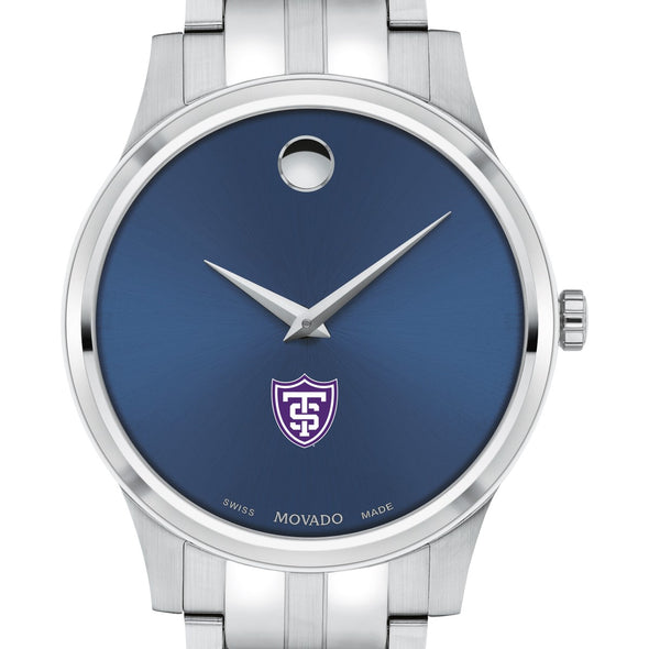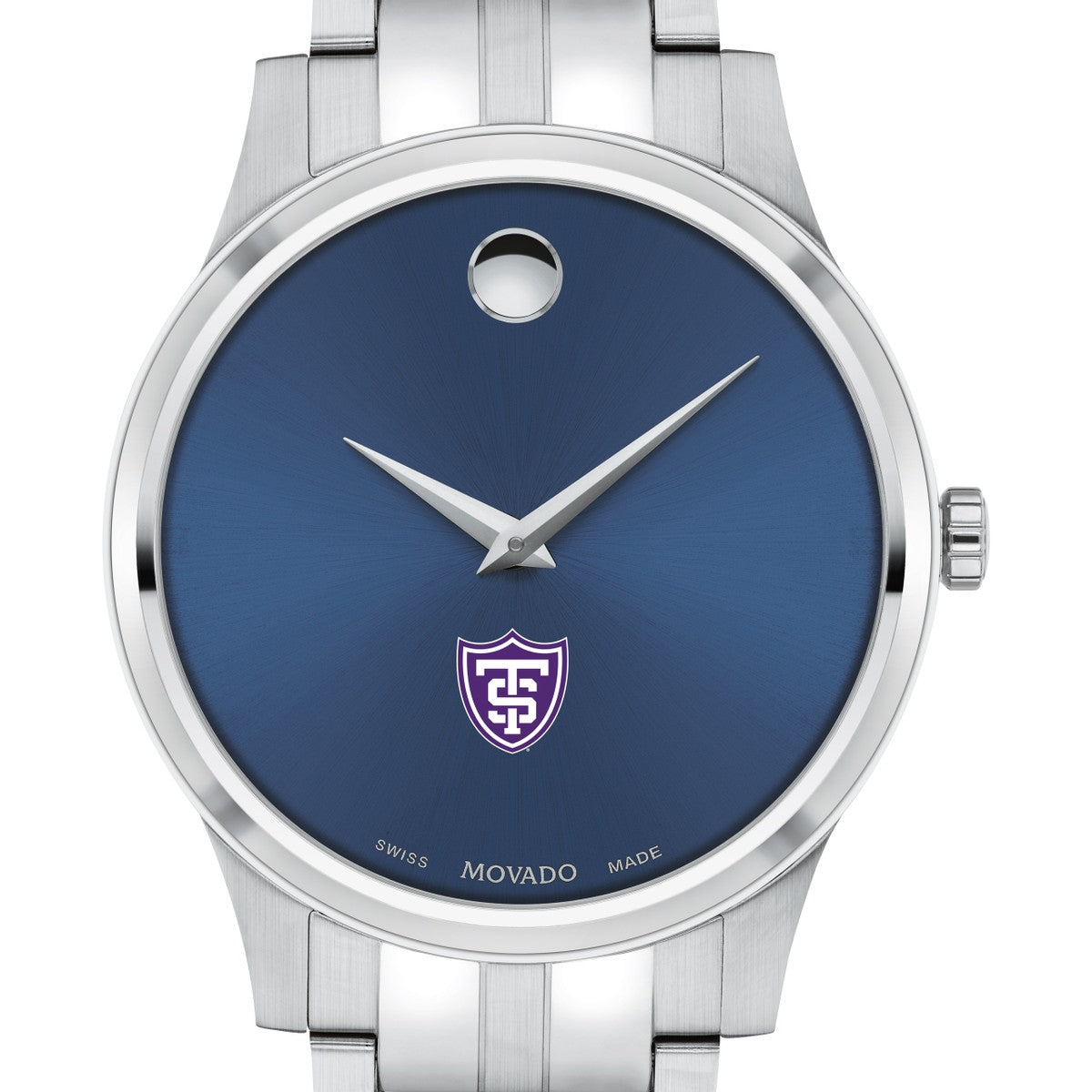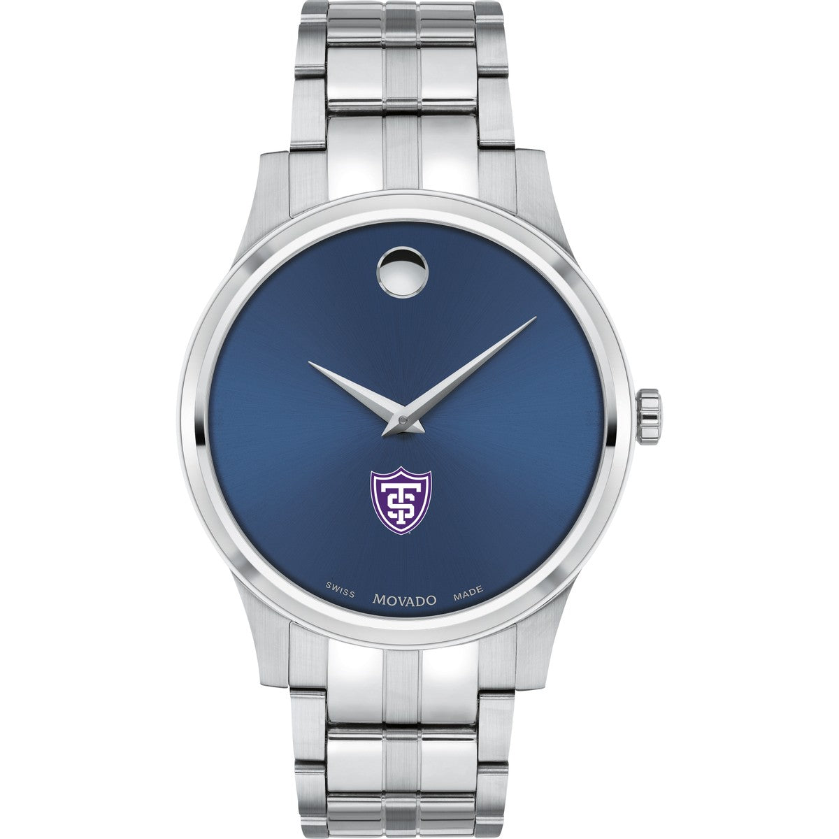 The University of St. Thomas Men's Movado Collection watch boasts a striking blue dial featuring the iconic St. Thomas Logo in full color. This timeless timepiece, renowned for its concave dot representing the sun at high noon, has been a symbol of elegance since its inception in 1947. Make it uniquely yours with free engraving without affecting order processing time.