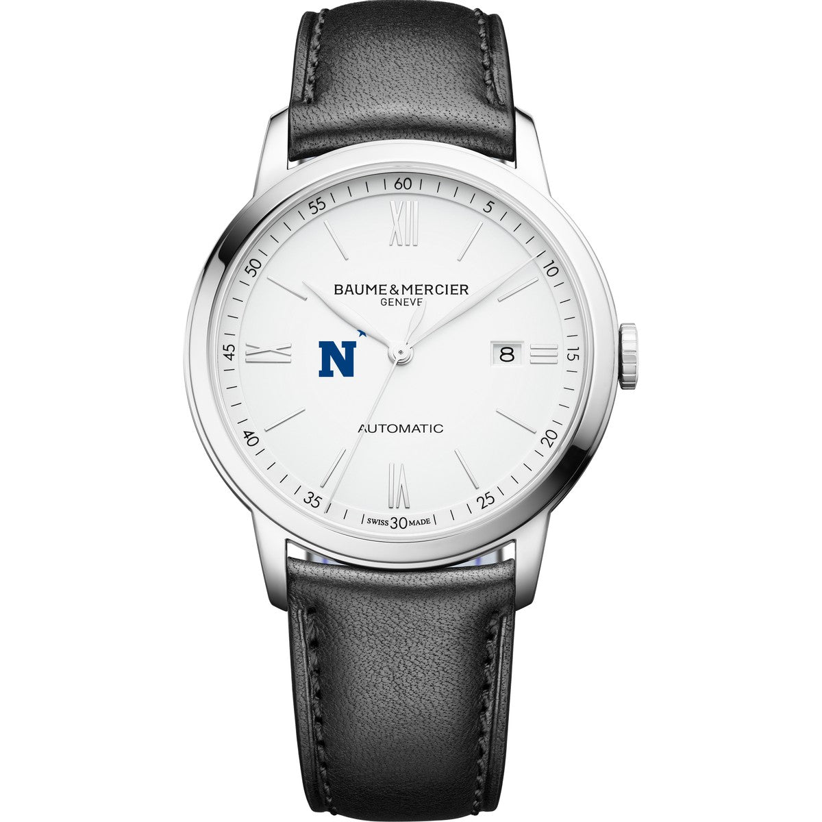 Experience the perfect fusion of school traditions and modern innovation with the USNA Men's Baume et Mercier 42mm Classima Automatic Watch. Its crisp white matte dial with the USNA logo, polished steel hands, and black leather strap embody effortless elegance and superior Swiss craftsmanship. Complimentary personal engraving.
