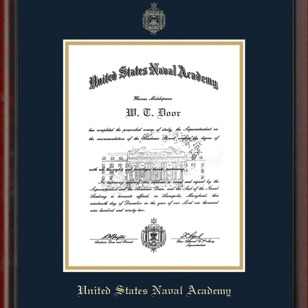 This US Naval Academy diploma frame is crafted from solid wood in the USA. Proudly display your USNA diploma with museum quality conservation mounting materials to showcase and protect your US Naval Academy diploma.