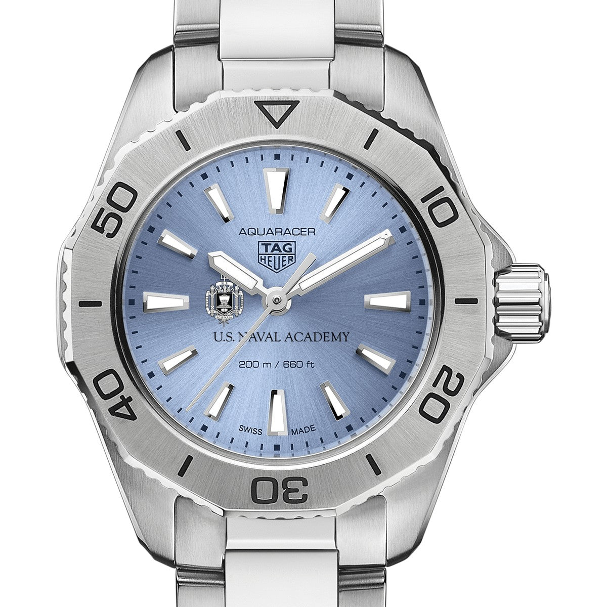 The US Naval Academy Women's TAG Heuer Steel Aquaracer with Blue Sunray Dial features the USNA Logo on a stunning light blue sunray brushed dial. Complimentary personal engraving.