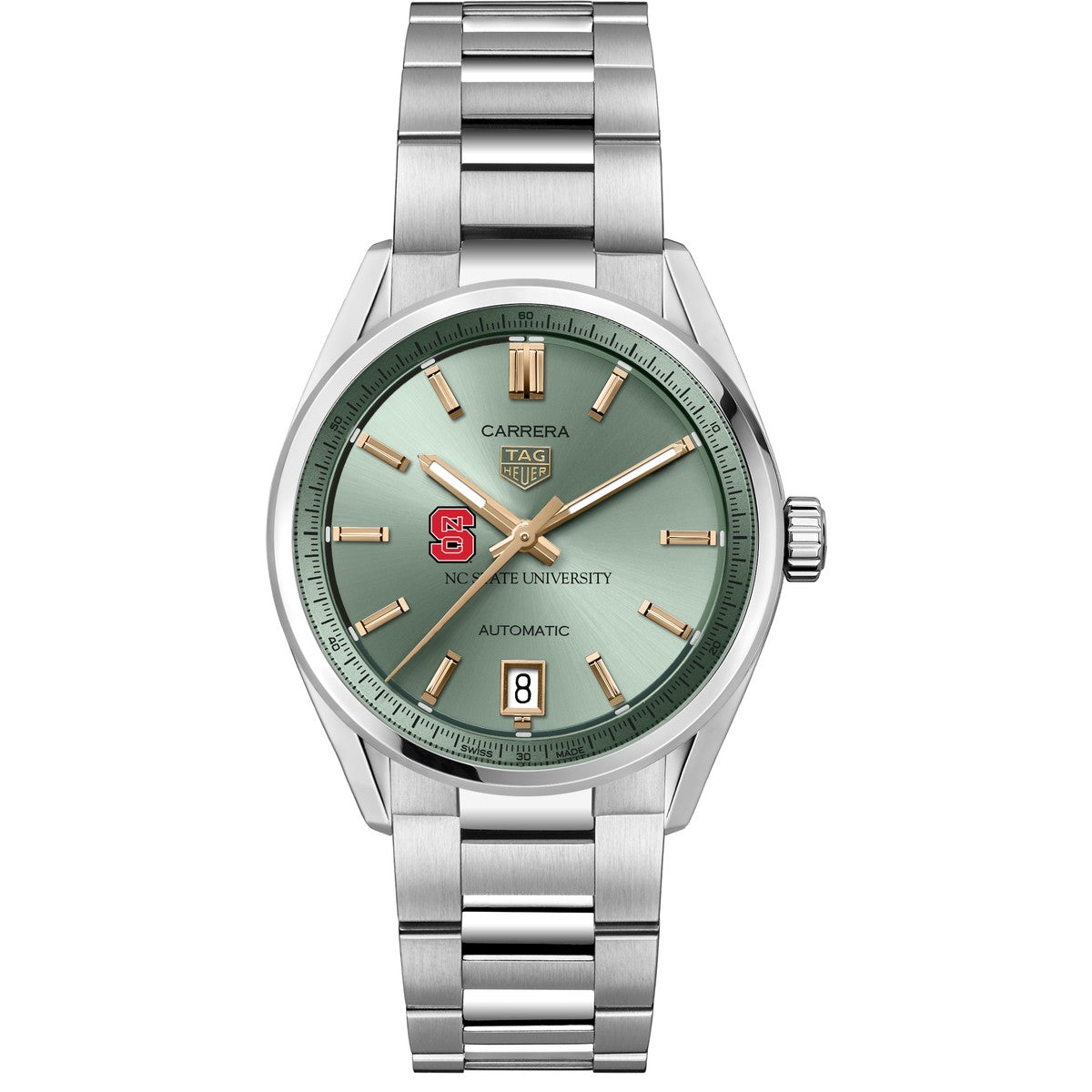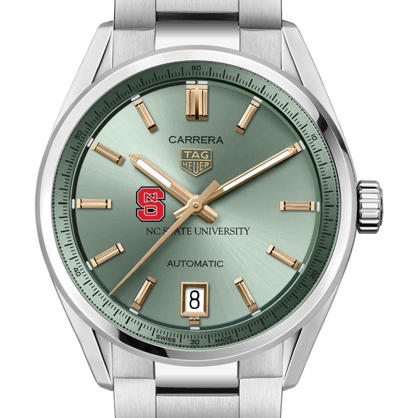 Explore the NC State Women's TAG Heuer Steel Carrera watch, featuring the NC State Logo on a pastel green sunray brushed dial with 18K 5N rose gold-plated hands and indexes. Equipped with the Calibre 7 movement, it combines style and superior functionality. Complimentary personal engraving.