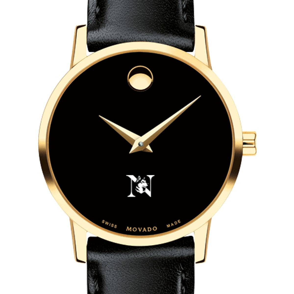 Northeastern University Women's Movado Museum watch features the Northeastern Logo in full color at 6 o'clock on black dial. Created in 1947, the iconic concave dot symbolizes the sun at high-noon. Complimentary personal engraving.