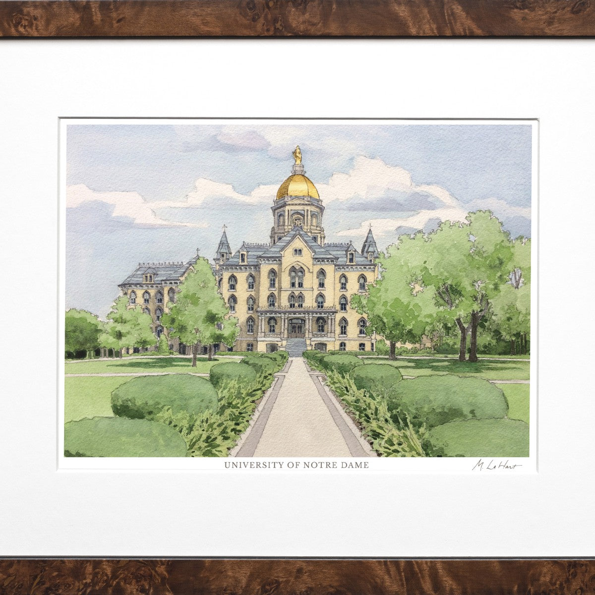 M.LaHart has created an original 8" x 11" Notre Dame watercolor of this timeless campus scene. Each limited edition, hand numbered print is reproduced with high quality giclée printing, used for fine art reproductions. A classic accent for the home or office. Used for fine art reproductions, giclée printing involves transferring millions of tiny drops of ink to archival-quality paper, capturing the fine nuances of the original – including tone, shade and brushstrokes.