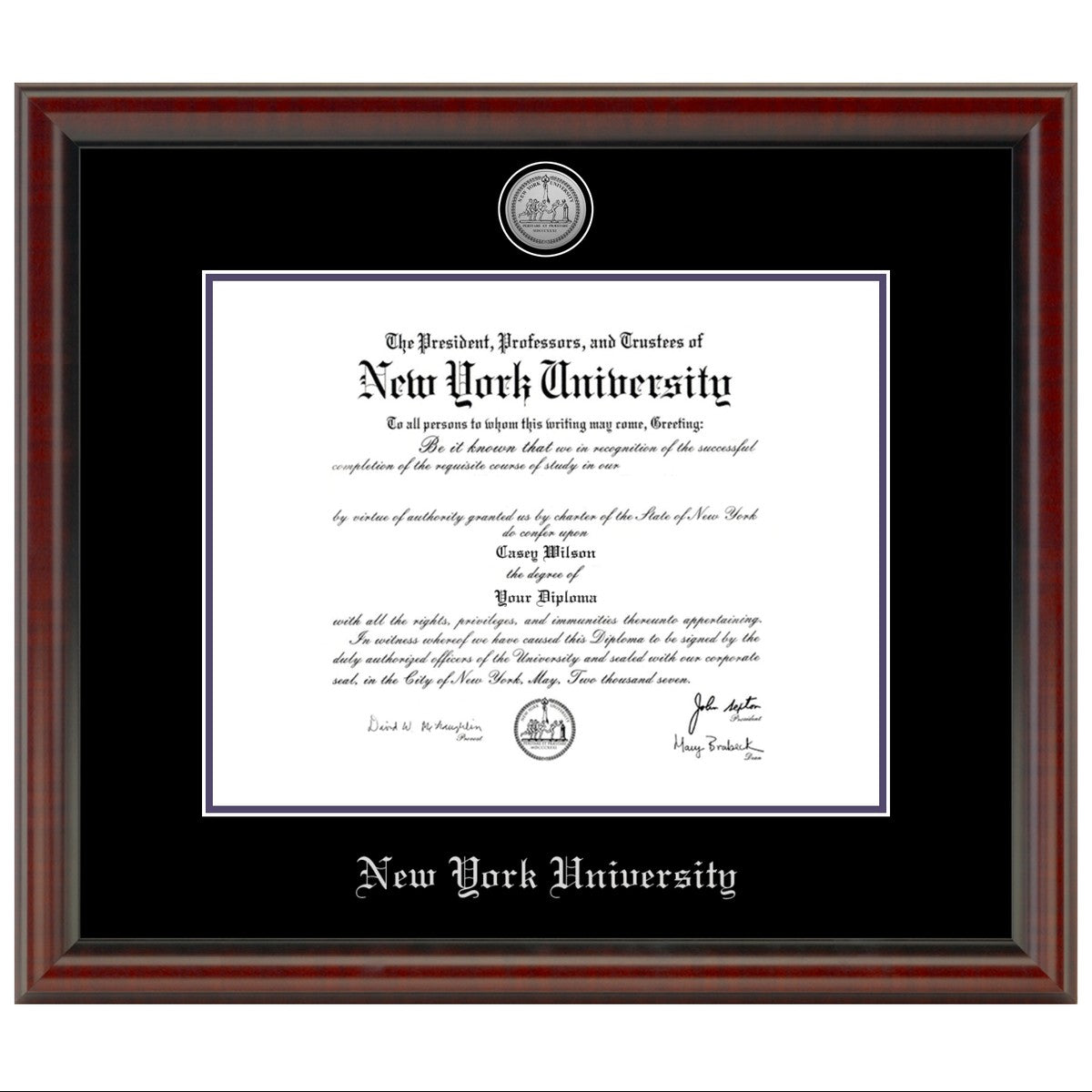 Highlighted by the silver medallion above the New York University diploma, this frame is sure to stand out in your home or office. Crafted in the USA of the finest hardwood with museum quality conservation mounting materials to showcase and protect your diploma.