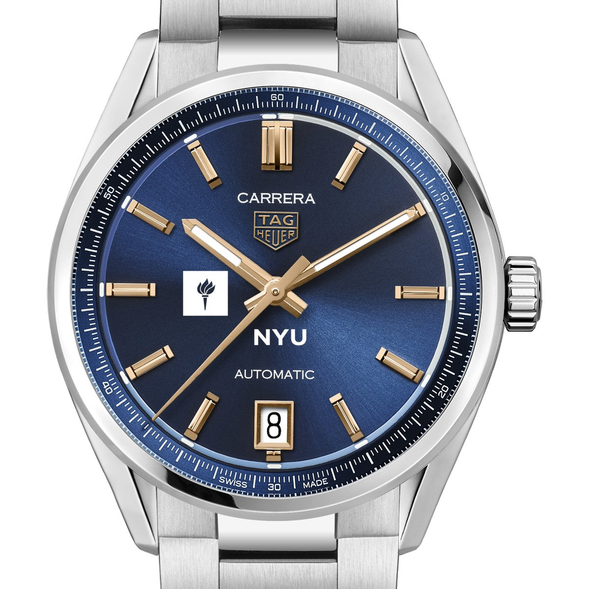 Discover the NYU Women's TAG Heuer Steel Carrera watch, showcasing the NYU Logo on a deep-blue sunray brushed dial with 18K 5N rose gold-plated hands and indexes. Powered by the Calibre 7 movement, this timepiece is designed for precision and excellence. Complimentary personal engraving.