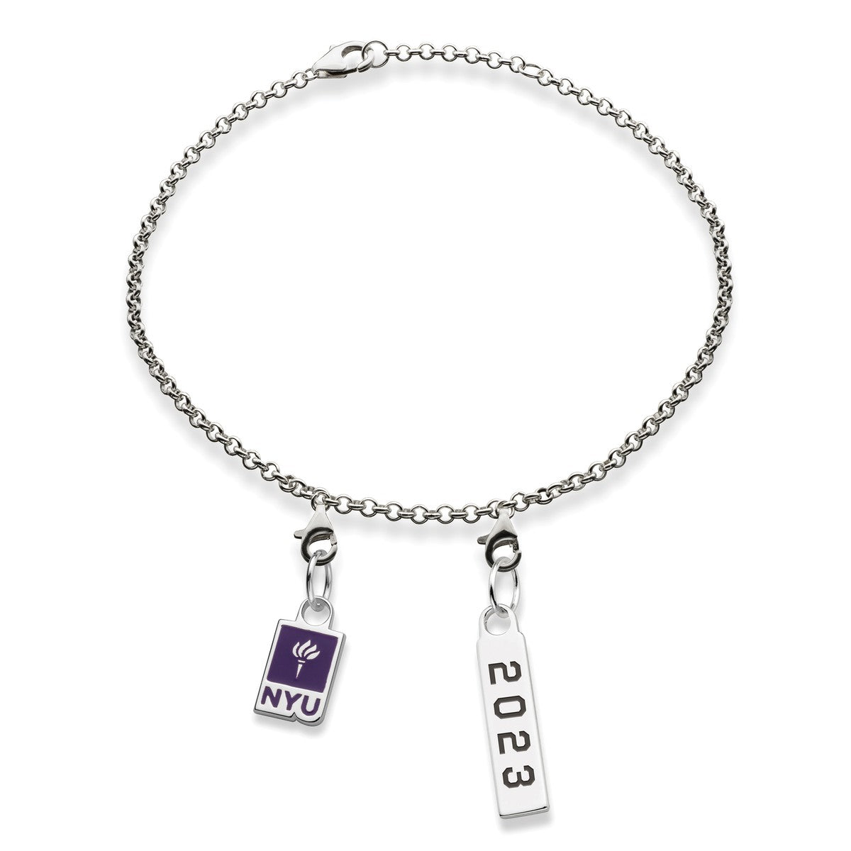 Make a statement with our New York University sterling silver bracelet. This eye-catching bracelet is adorned with two sterling silver charms, one featuring the school logo in colored enamel, the other with the graduation year.
