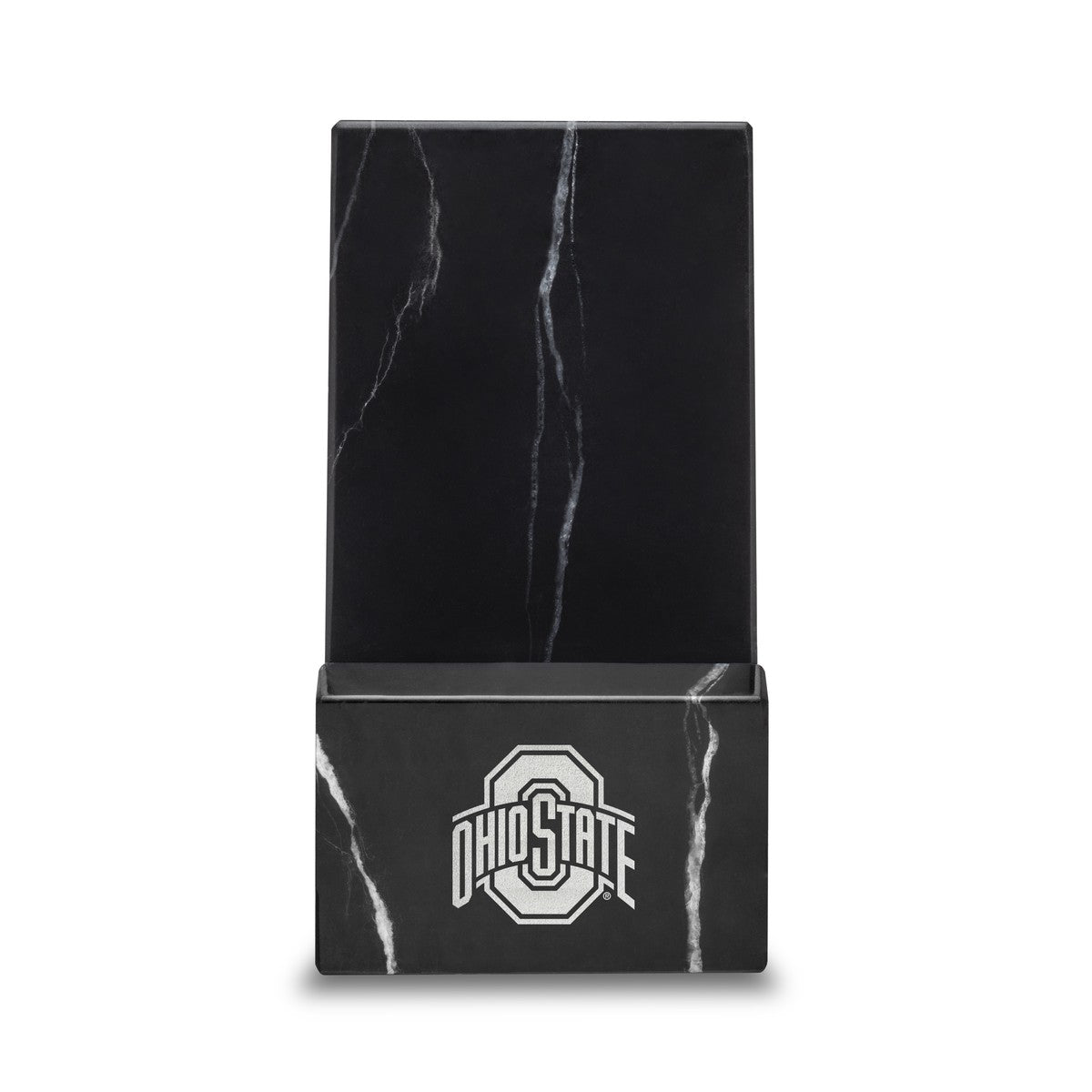 The perfect companion to our marble card holder, the officially licensed Ohio State University marble phone holder is an essential accessory for every Ohio State fan's desk. The Ohio State Logo is elegantly featured on the front of this substantial, solid marble phone holder and accommodates most smartphones.