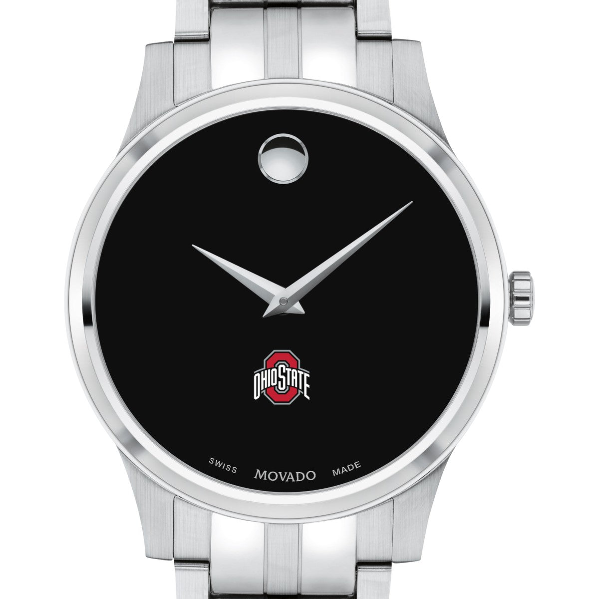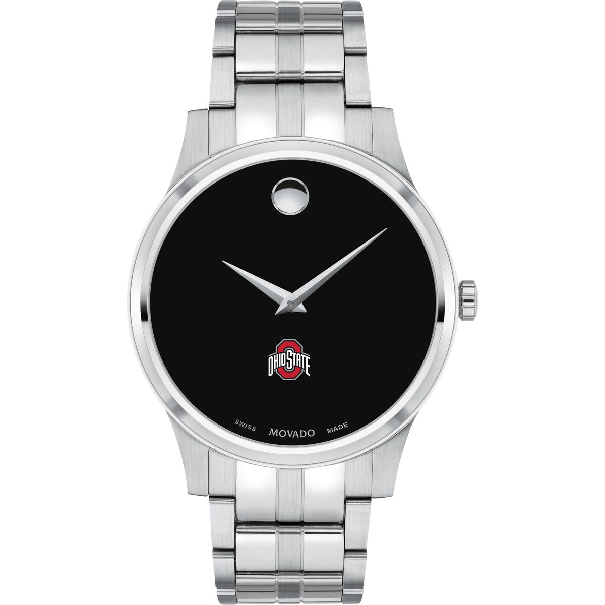The Ohio State University Men's Movado Collection watch showcases the iconic Ohio State Logo in full color on a sophisticated black dial. This classic timepiece, featuring the renowned concave dot symbolizing the sun at high noon, has been a design masterpiece since its creation in 1947. Personalize your watch with free engraving without any delay to your order.