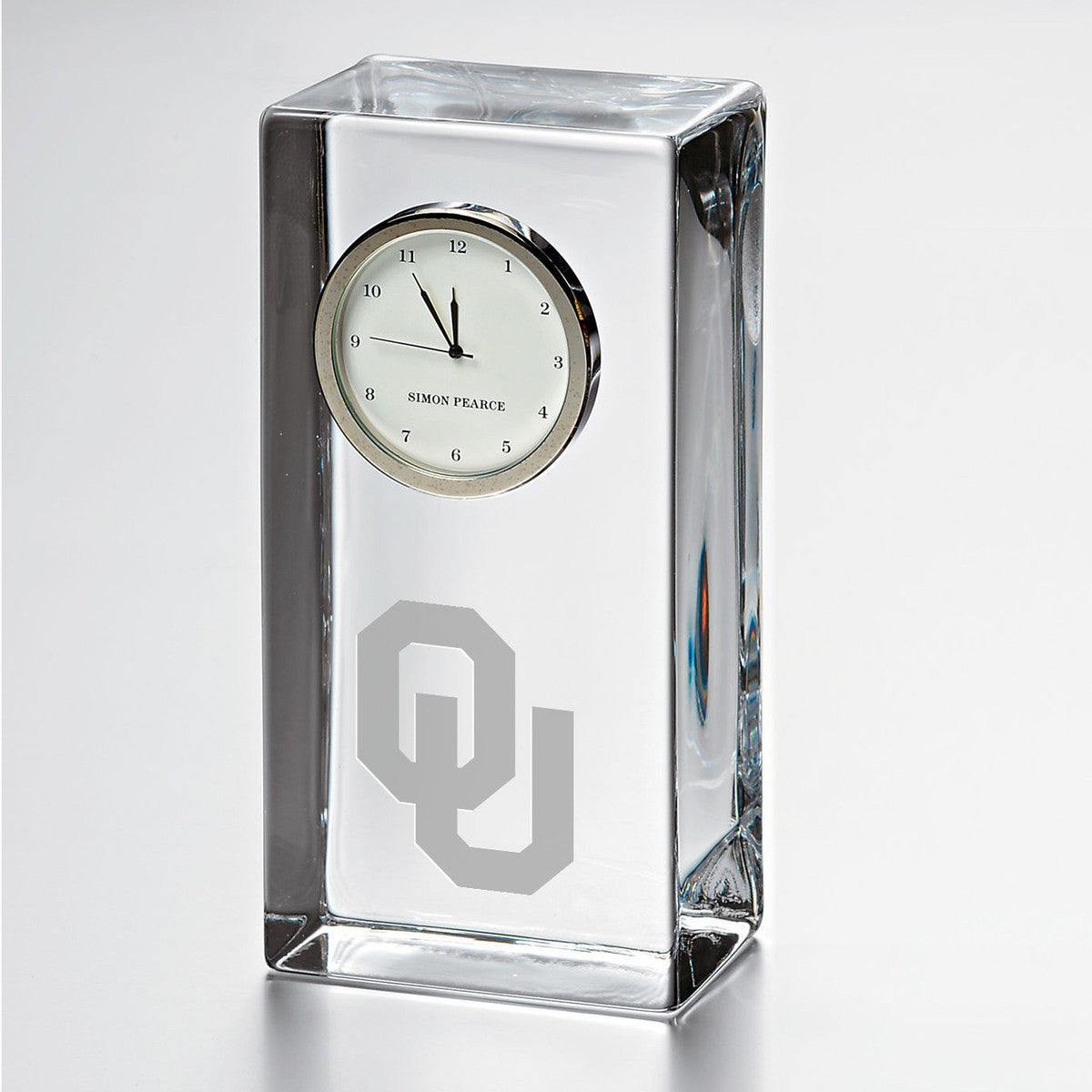The Oklahoma Tall Glass Desk Clock stands proudly on any surface, distinctly etched with the Oklahoma Logo. The clock showcases a traditional numbered face with a sweep hand to count the seconds.