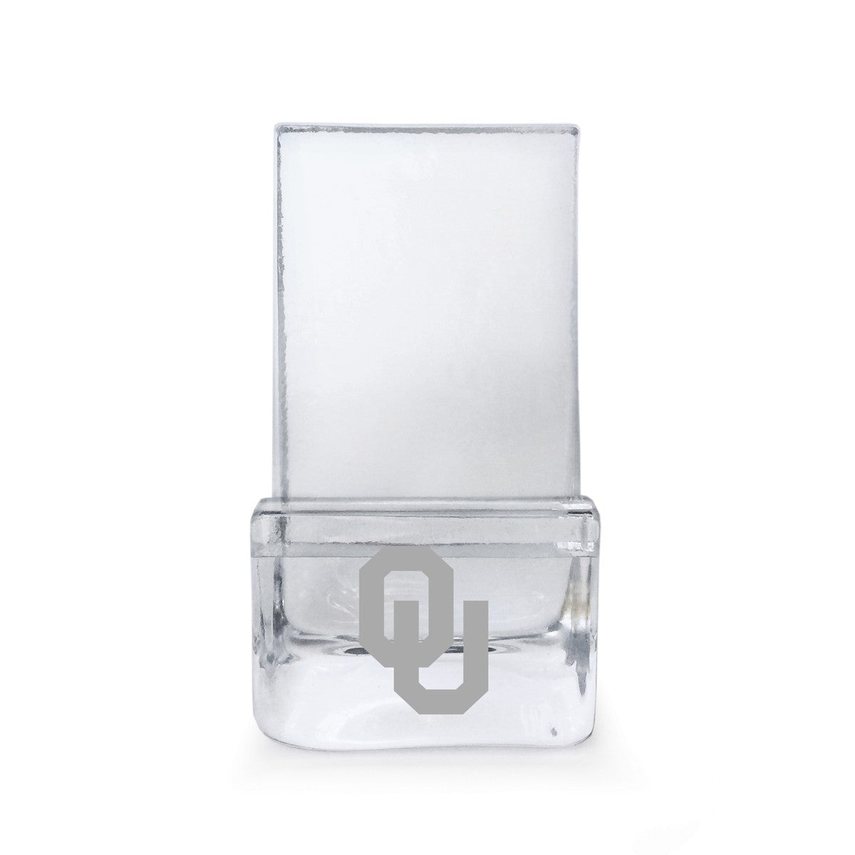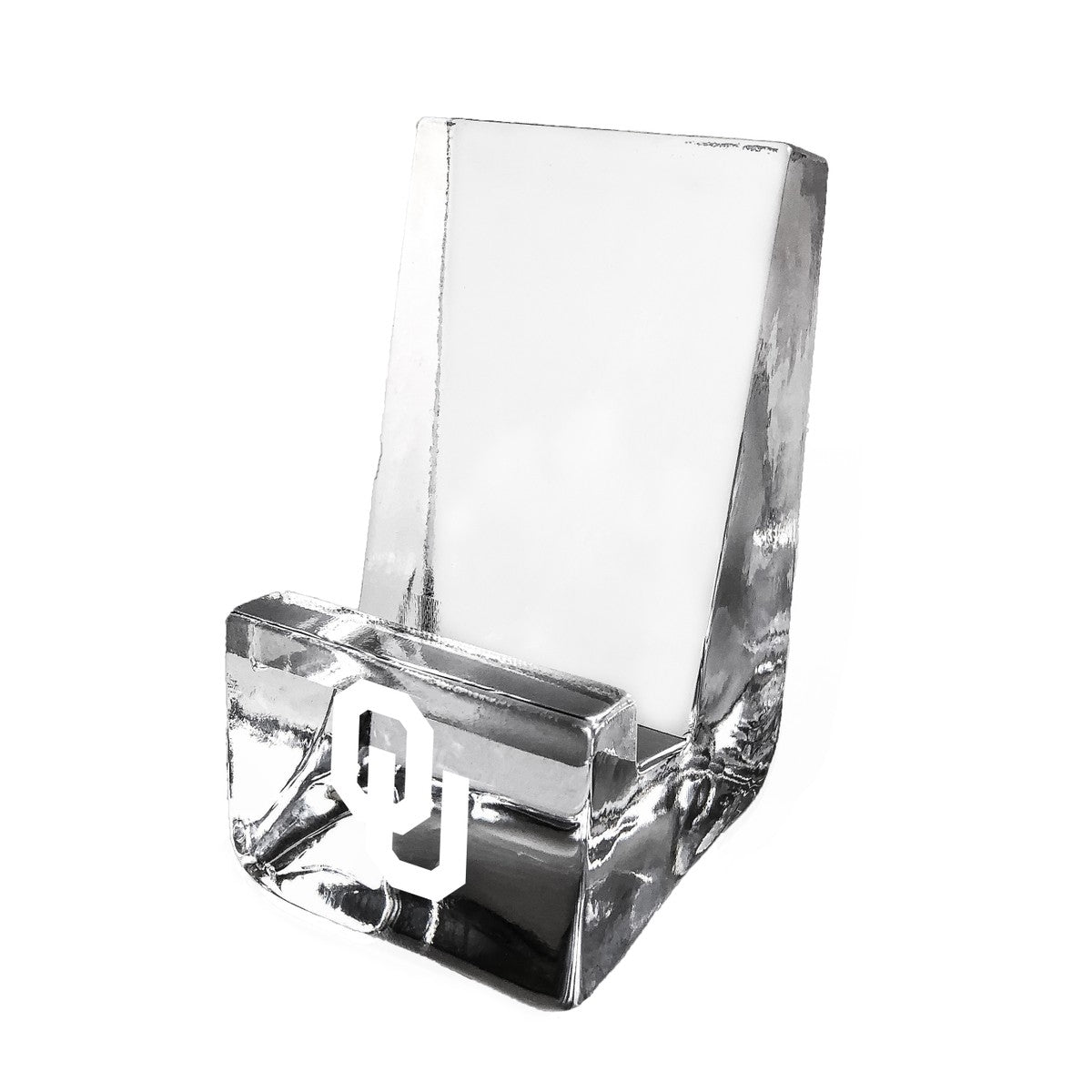 This handcrafted University of Oklahoma Glass Phone Holder is the perfect addition to your work or home environment. Formed from only the finest clear glass, the Oklahoma Logo is distinctly etched on the front.