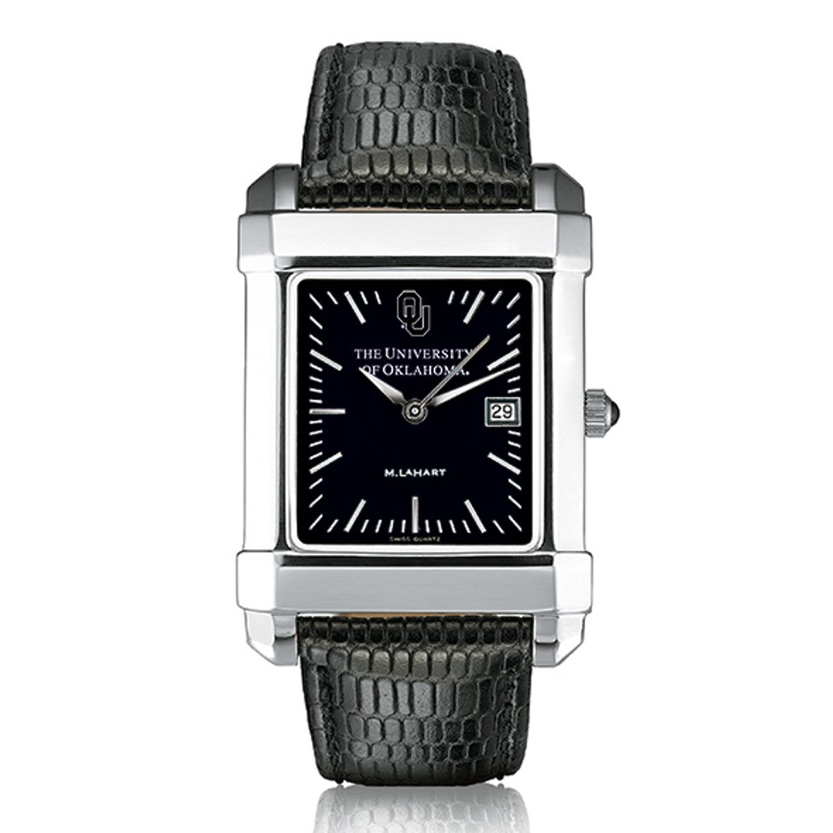 University of Oklahoma men's steel watch featuring OU logo at 12 o'clock and "The University of Oklahoma" inscribed below on the black dial.