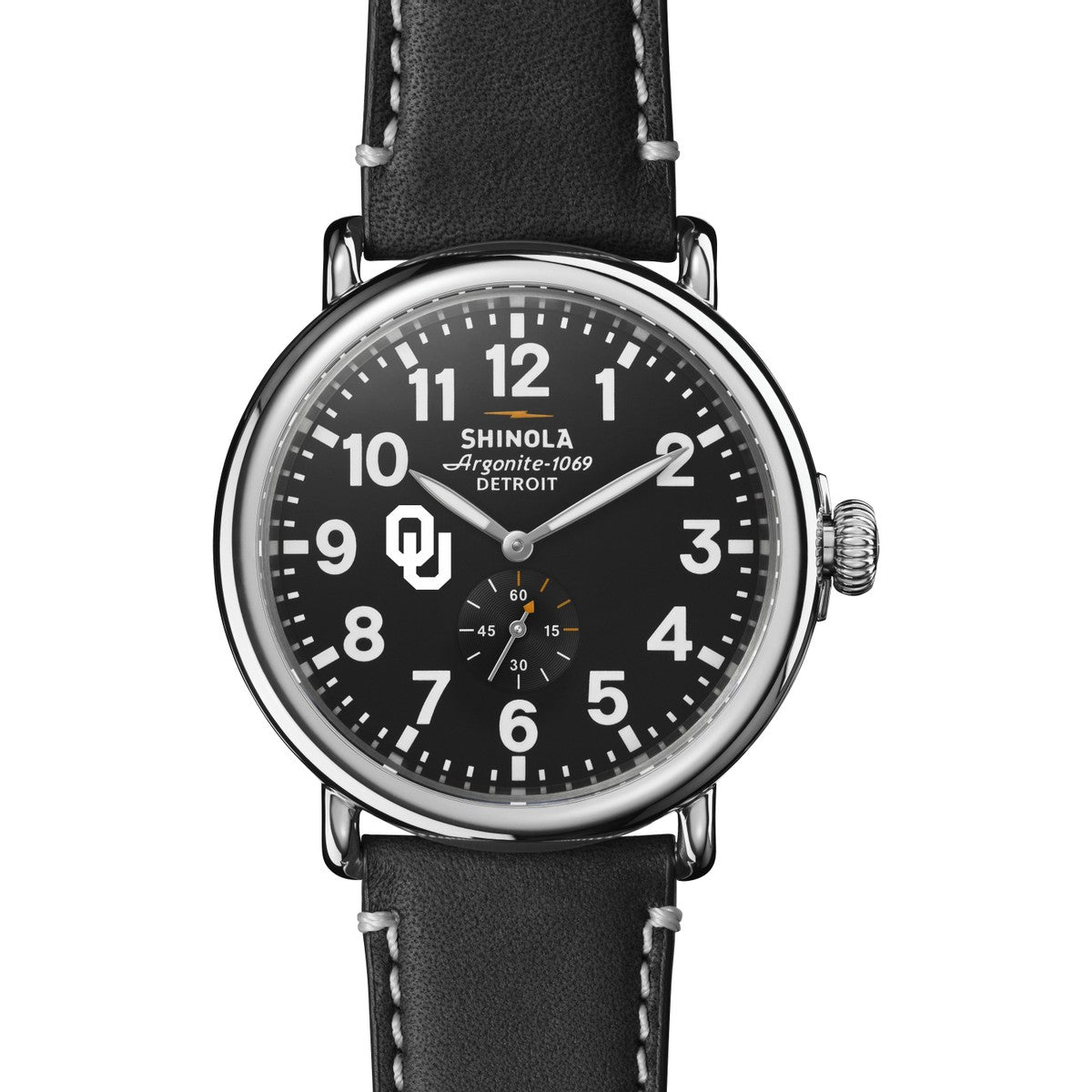 The Shinola Runwell features the Oklahoma Logo in color on the black dial with a large 47 mm case. Every detail of Shinola's flagship timepiece has been engineered with an obsessive focus to ensure it can be worn any way but it can't be worn out. Complimentary personal engraving