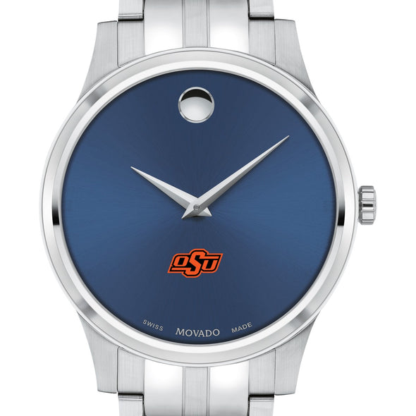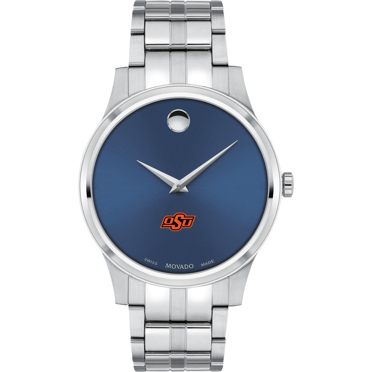 The Oklahoma State University Men's Movado Collection watch boasts a striking blue dial featuring the iconic Oklahoma State logo in full color. This timeless timepiece, renowned for its concave dot representing the sun at high noon, has been a symbol of elegance since its inception in 1947. Make it uniquely yours with free engraving without affecting order processing time.