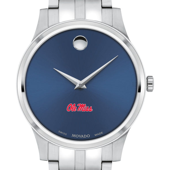 The University of Mississippi Men's Movado Collection watch boasts a striking blue dial featuring the iconic Ole Miss Logo in full color. This timeless timepiece, renowned for its concave dot representing the sun at high noon, has been a symbol of elegance since its inception in 1947. Make it uniquely yours with free engraving without affecting order processing time.
