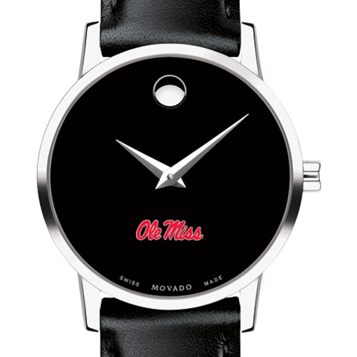 University of Mississippi Women's Movado Museum watch features the Ole Miss Logo in full color at 6 o'clock on black dial. Created in 1947, the iconic concave dot symbolizes the sun at high-noon. Complimentary personal engraving.