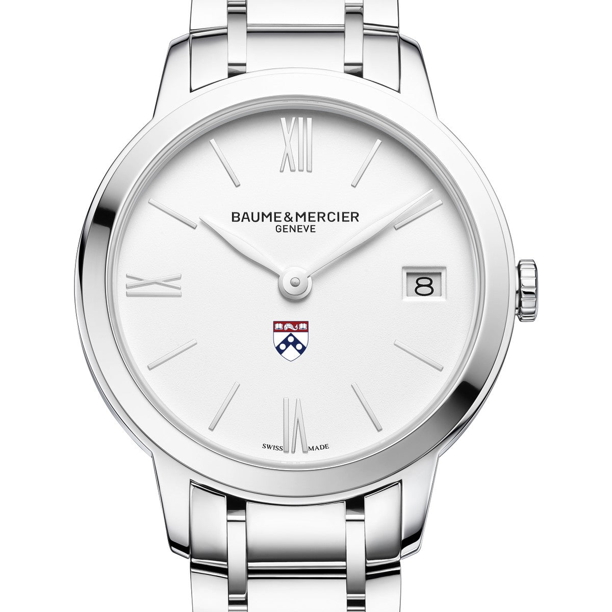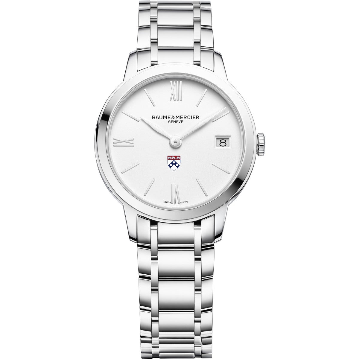 Timeless beauty defines the Penn Women's Baume et Mercier 31mm Classima Watch, featuring a white matte dial with the Penn logo, luminous rhodium-plated hands, and a polished steel bracelet. A sophisticated timepiece to complement any ensemble with grace. Complimentary personal engraving.