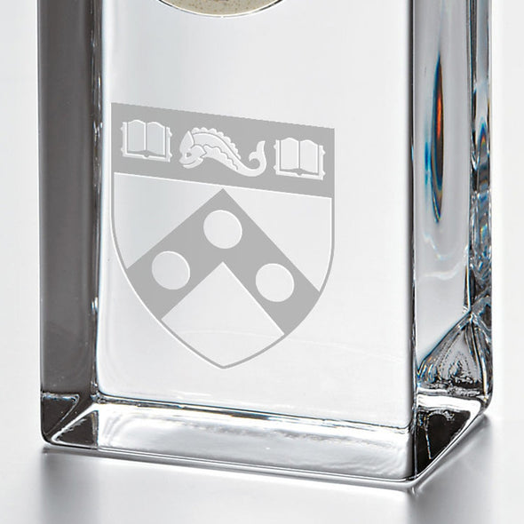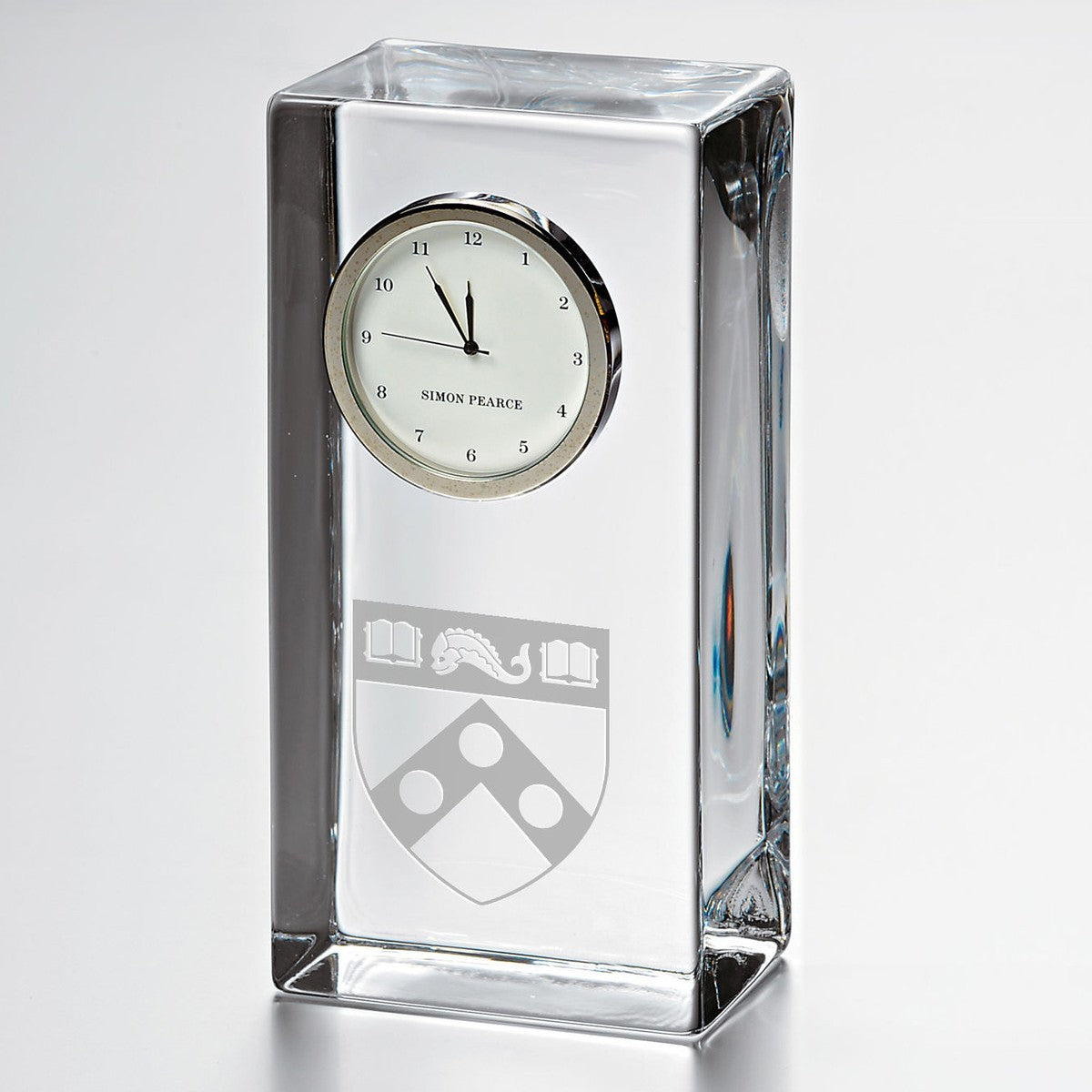The Penn Tall Glass Desk Clock stands proudly on any surface, distinctly etched with the Penn Logo. The clock showcases a traditional numbered face with a sweep hand to count the seconds.