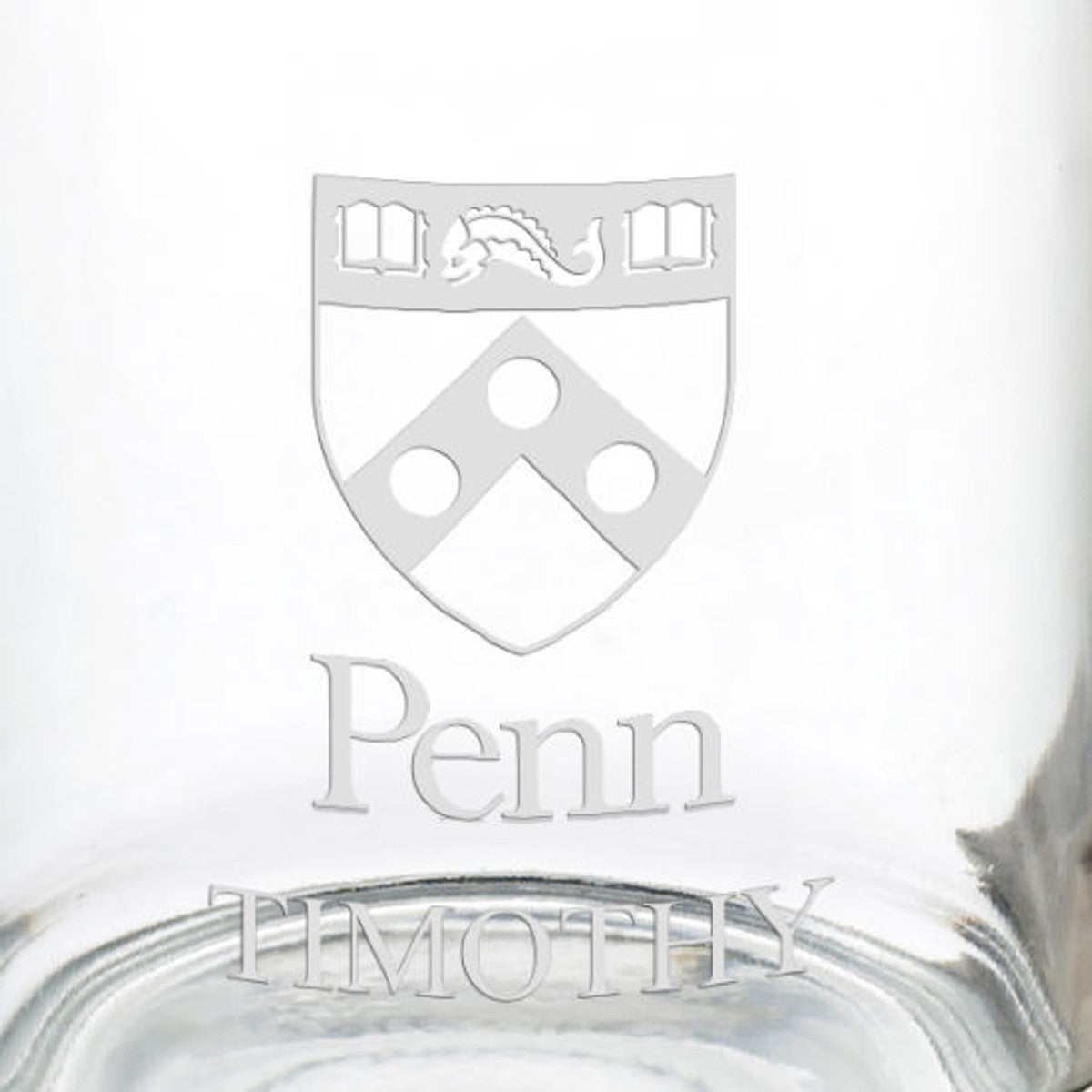 The Penn glass coffee mug is deep-etched with the University of Pennsylvania logo. Generously proportioned 13 oz glasses are a pleasure to hold. Your name can be added under the logo for free.