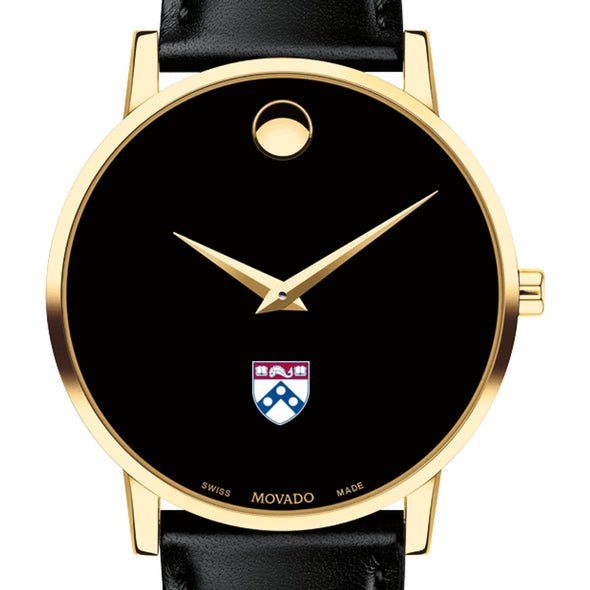 University of Pennsylvania Men's Movado Museum watch features the Penn Logo in full color at 6 o'clock on black dial. Created in 1947, the iconic concave dot symbolizes the sun at high-noon. Complimentary personal engraving.