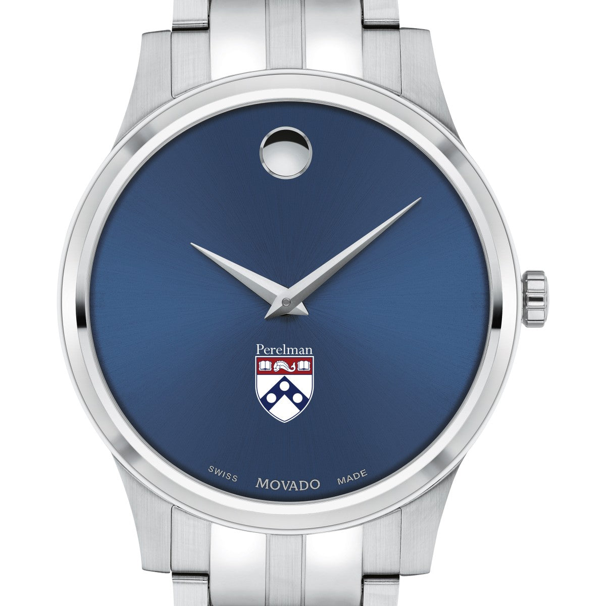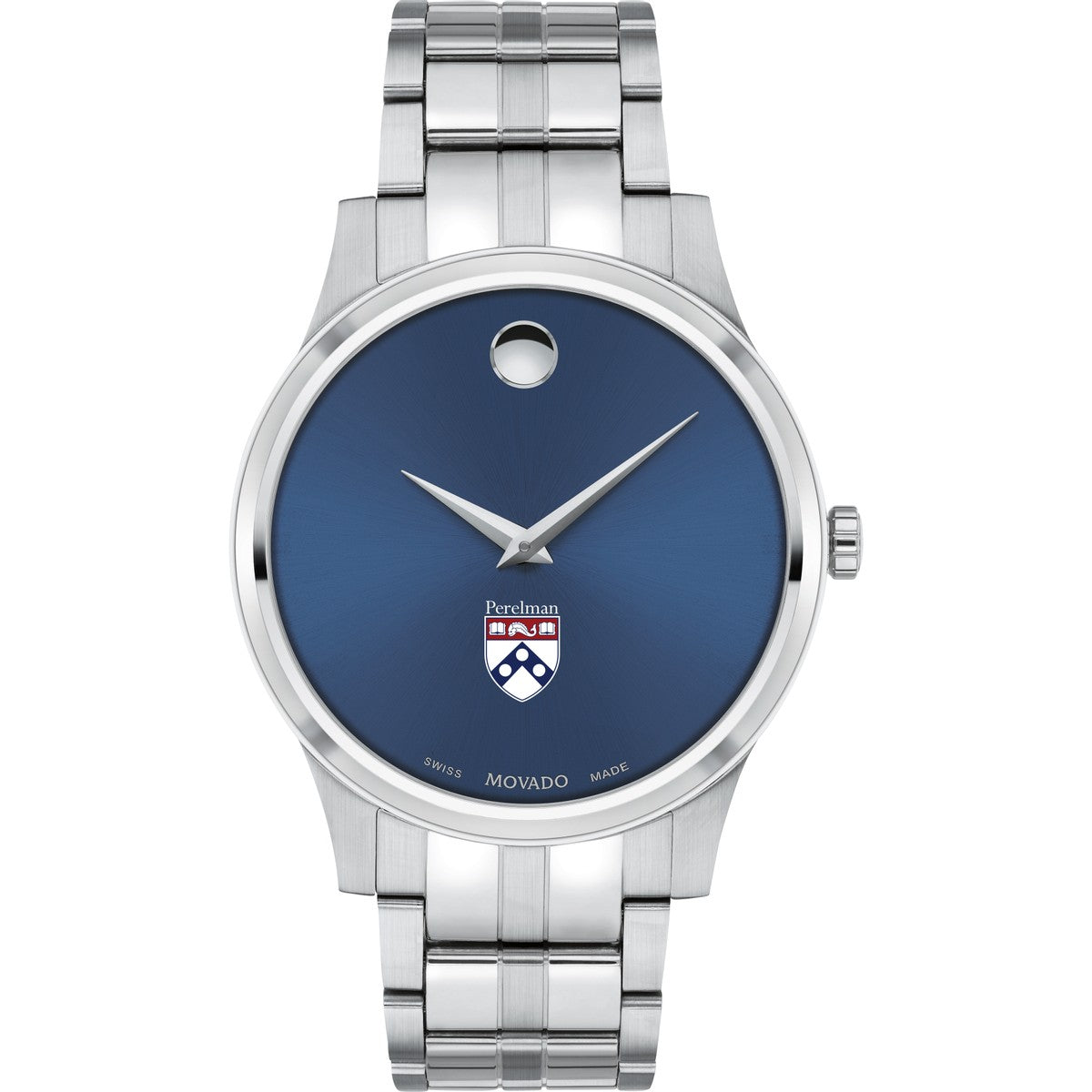 The Perelman School of Medicine Men's Movado Collection watch boasts a striking blue dial featuring the iconic Penn Med logo in full color. This timeless timepiece, renowned for its concave dot representing the sun at high noon, has been a symbol of elegance since its inception in 1947. Make it uniquely yours with free engraving without affecting order processing time.