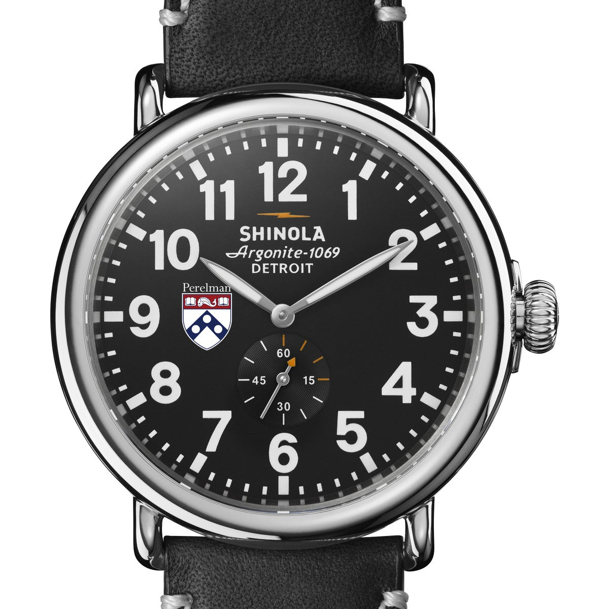 The Shinola Runwell features the Penn Med logo in color on the black dial with a large 47 mm case. Every detail of Shinola's flagship timepiece has been engineered with an obsessive focus to ensure it can be worn any way but it can't be worn out. Complimentary personal engraving