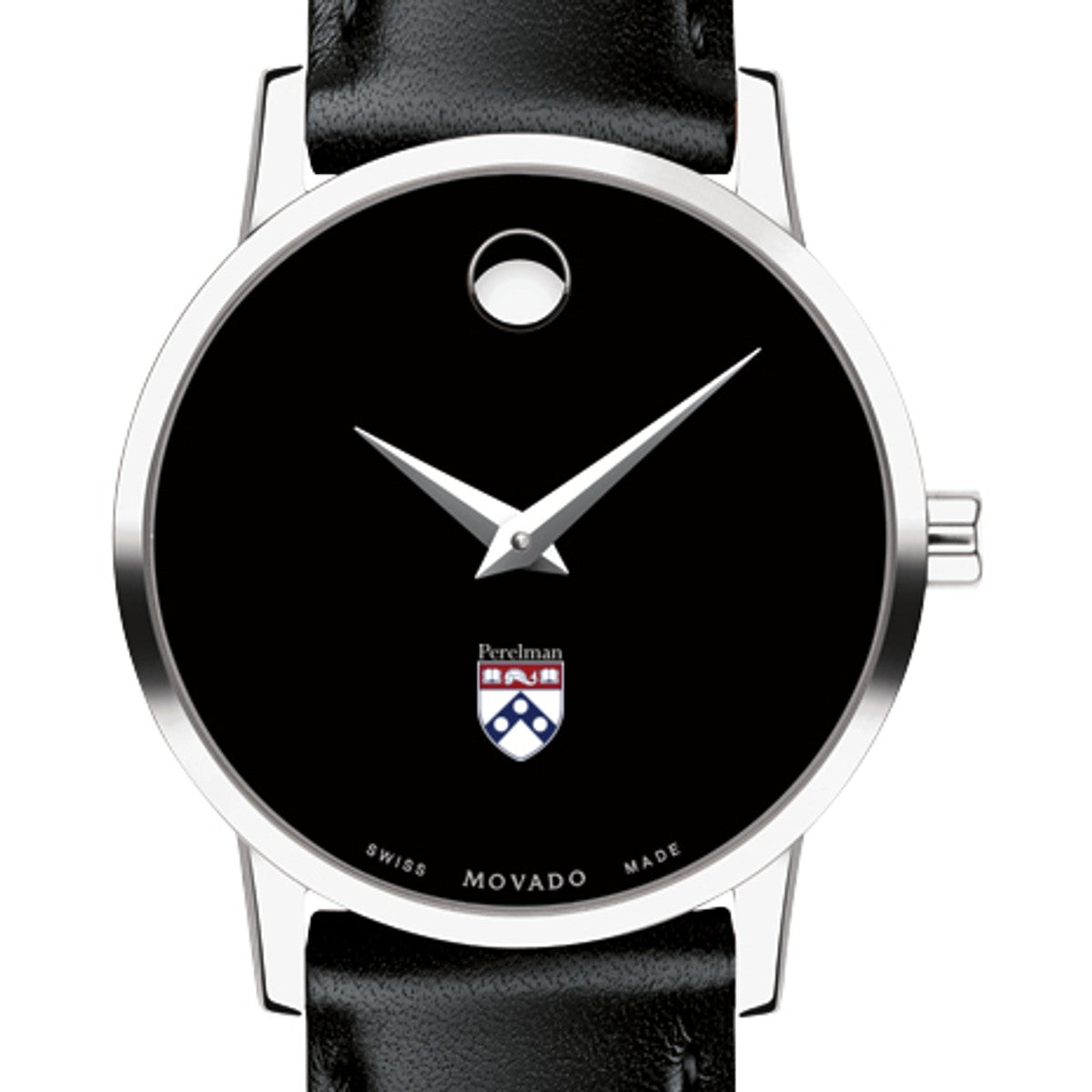 Perelman School of Medicine Women's Movado Museum watch features the Penn Med logo in full color at 6 o'clock on black dial. Created in 1947, the iconic concave dot symbolizes the sun at high-noon. Complimentary personal engraving.