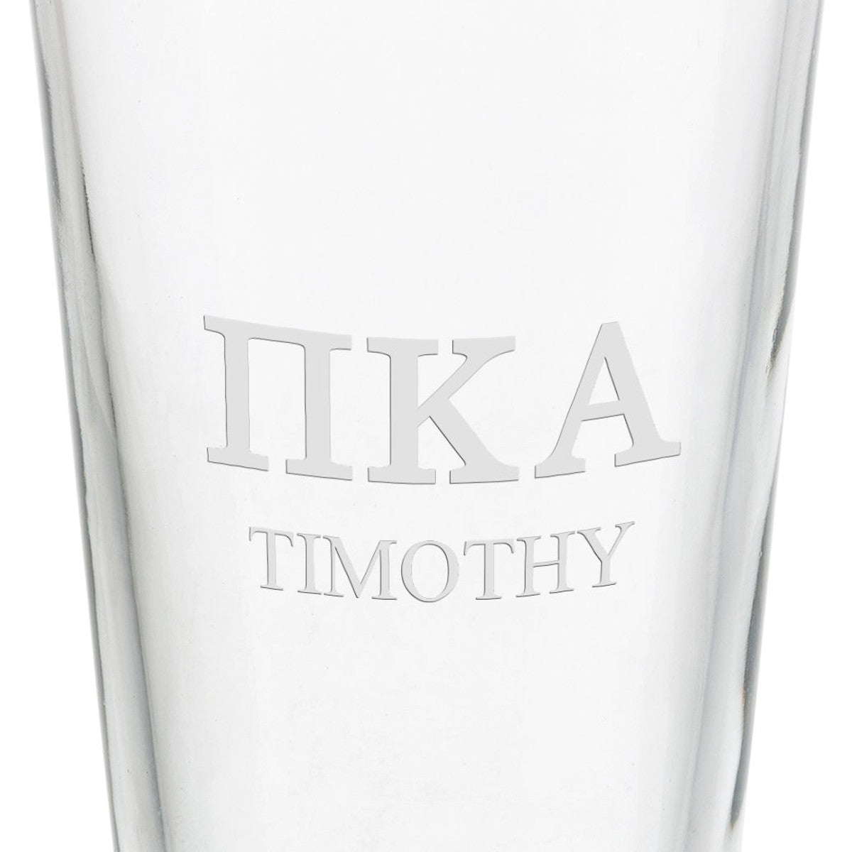 Each Pi Kappa Alpha 16 oz pint glass is deep-etched with the Pi Kappa Alpha logo. Its simple styling and crystal-clear clarity make this glass perfect for any drink. Your name can be added under the logo for free.