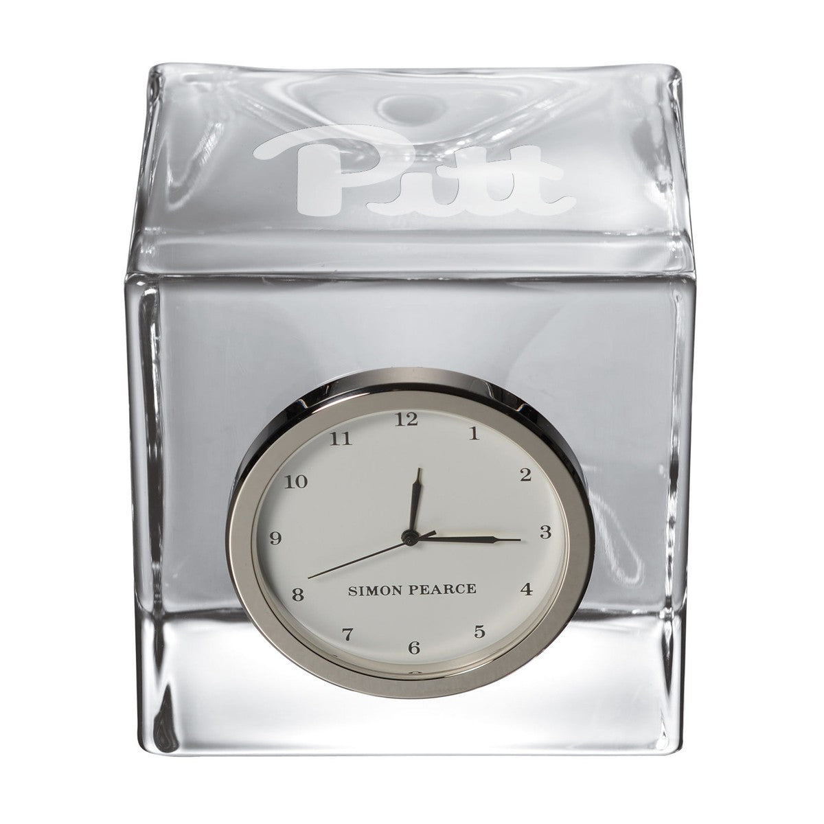 The Pitt Glass Desk Clock is distinctly etched with the Pitt Logo, and is a great addition to any surface. The clock includes a traditional numbered face with a sweep hand to count the seconds.