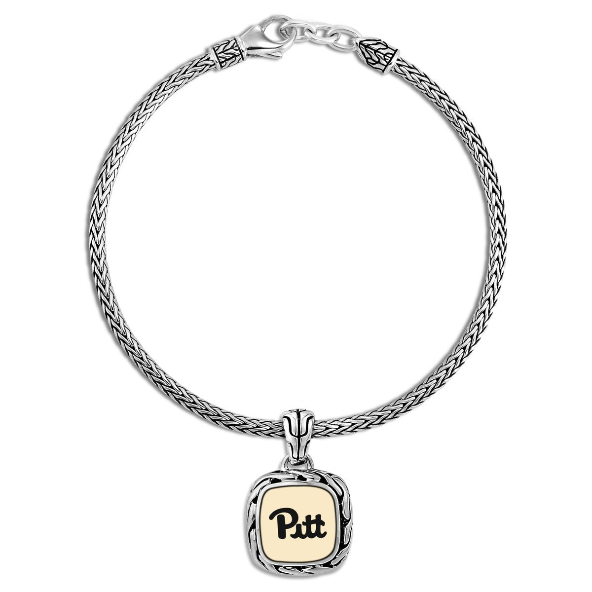 The sterling charm features an 18-karat gold center, intricately engraved with the Pitt Logo. The bracelet is handwoven from beautiful sterling silver strands, giving each piece authentic contours, movement and feel – and quintessential John Hardy style.