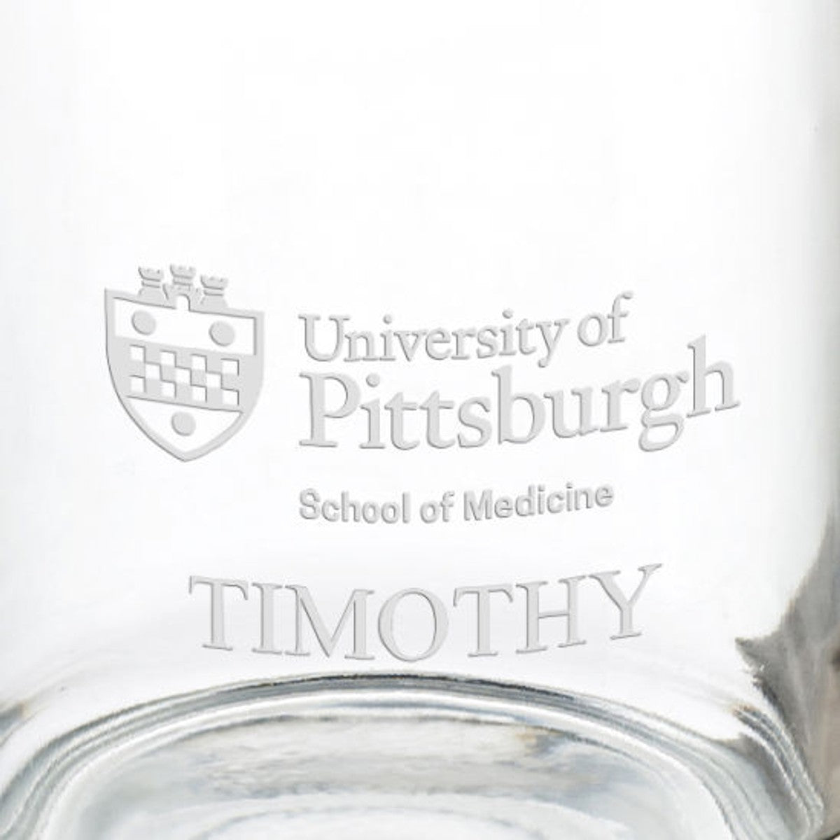 The Pitt Med glass coffee mug is deep-etched with the University of Pittsburgh School of Medicine logo. Generously proportioned 13 oz glasses are a pleasure to hold. Your name can be added under the logo for free.