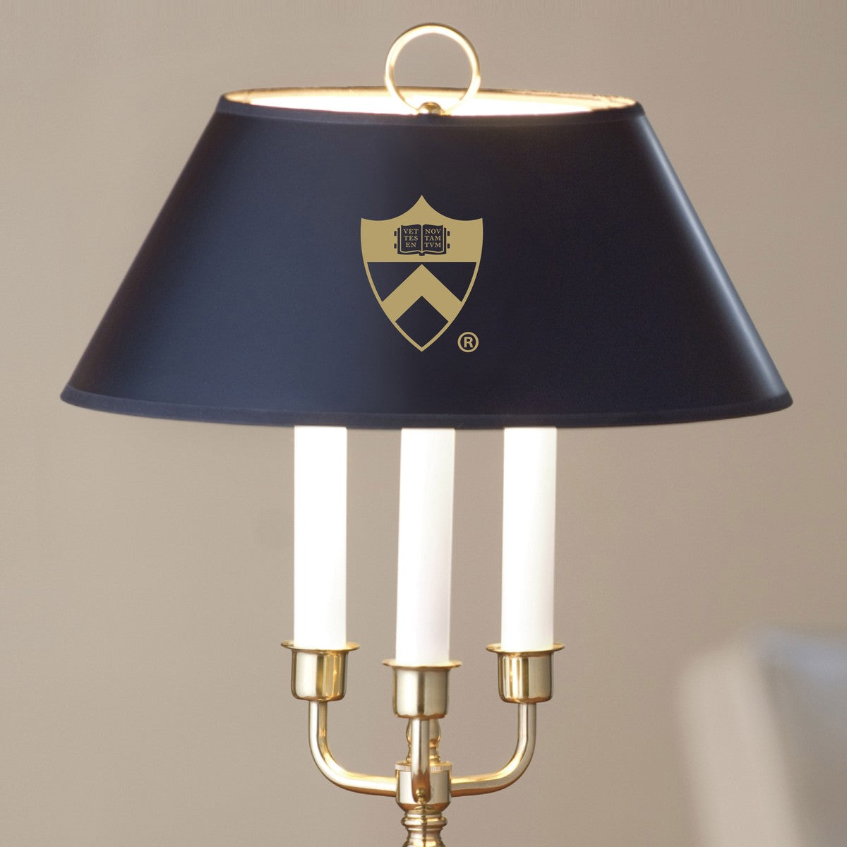 - Princeton Logo in gold on the black parchment shade