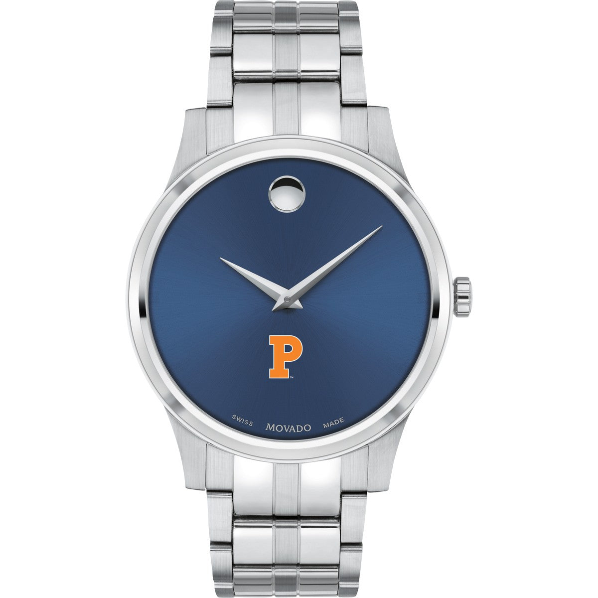 The Princeton University Men's Movado Collection watch boasts a striking blue dial featuring the iconic Princeton Logo in full color. This timeless timepiece, renowned for its concave dot representing the sun at high noon, has been a symbol of elegance since its inception in 1947. Make it uniquely yours with free engraving without affecting order processing time.