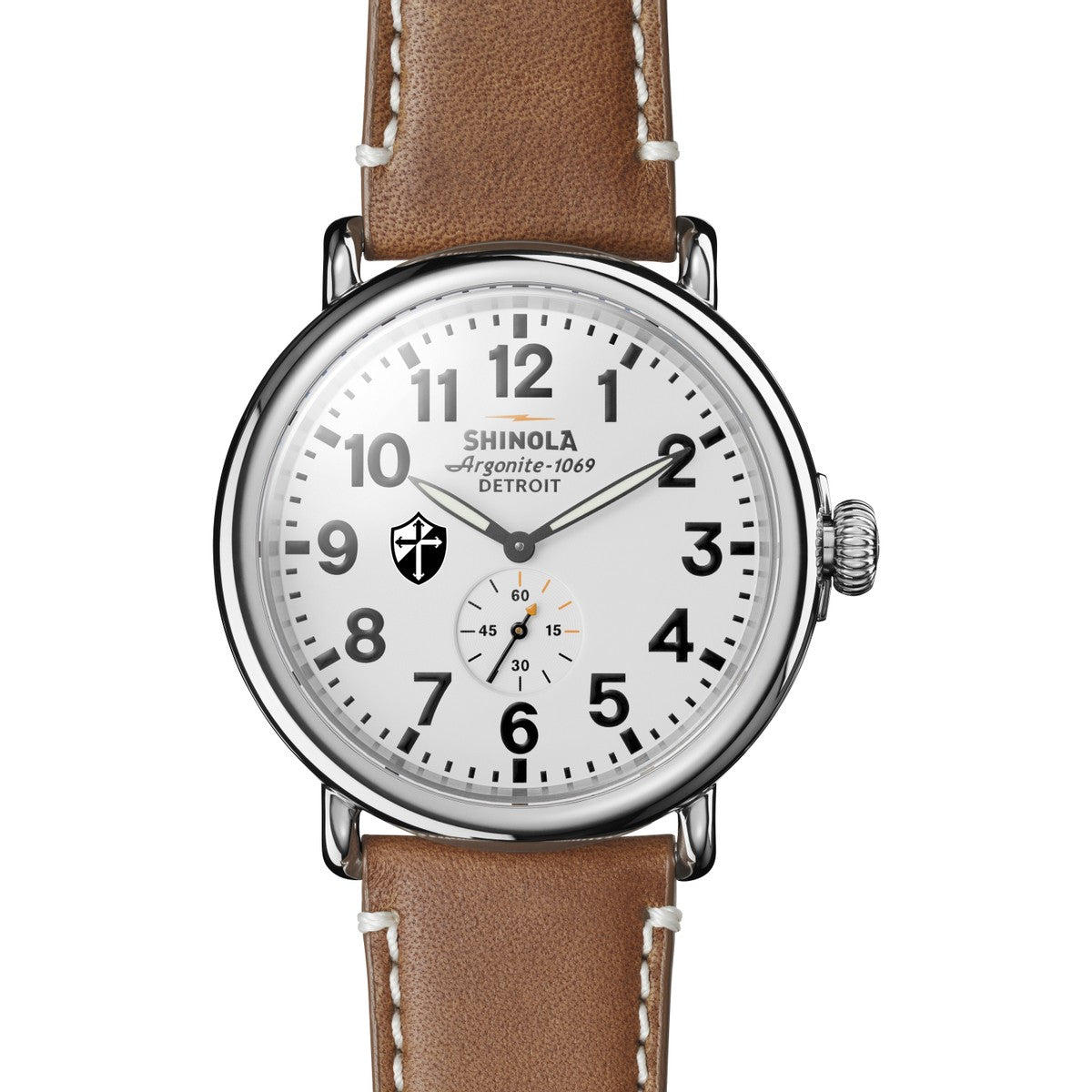 The Shinola Runwell features the Providence Logo in full color on the white dial with a large 47 mm case. Every detail of Shinola's flagship timepiece has been engineered with an obsessive focus to ensure it can be worn any way but it can't be worn out. Complimentary personal engraving